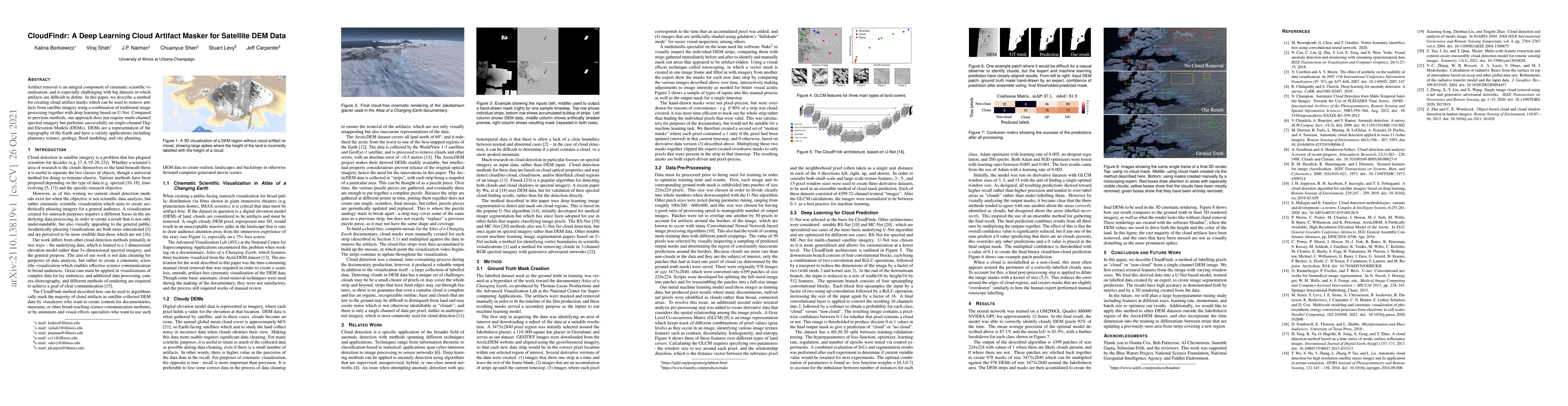 CloudFindr employs a deep learning method based on U-Net to create masks for cloud artifacts in satellite Digital Elevation Models (DEMs), enabling effective artifact removal without requiring multi-channel spectral imagery. This approach enhances the usability of DEMs for applications in planetary science, geology, flood modeling, and city planning.