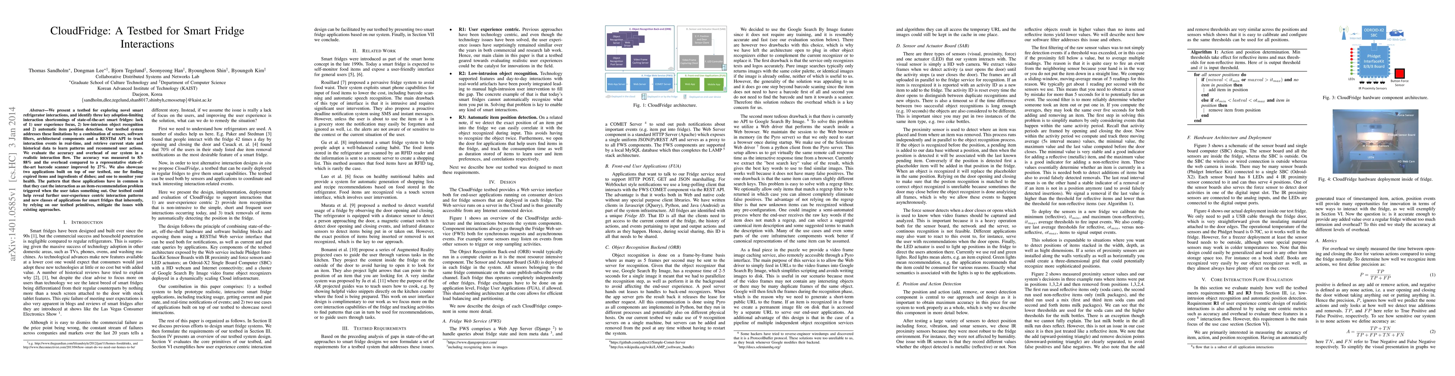 CloudFridge introduces a testbed to enhance smart fridge interactions by addressing key shortcomings in user experience, object recognition, and item position detection. The system employs sensors, software filters, and a RESTful API to track interactions and recommend actions, achieving 83-88% accuracy and a 27% overhead reduction compared to barcode scanners.
