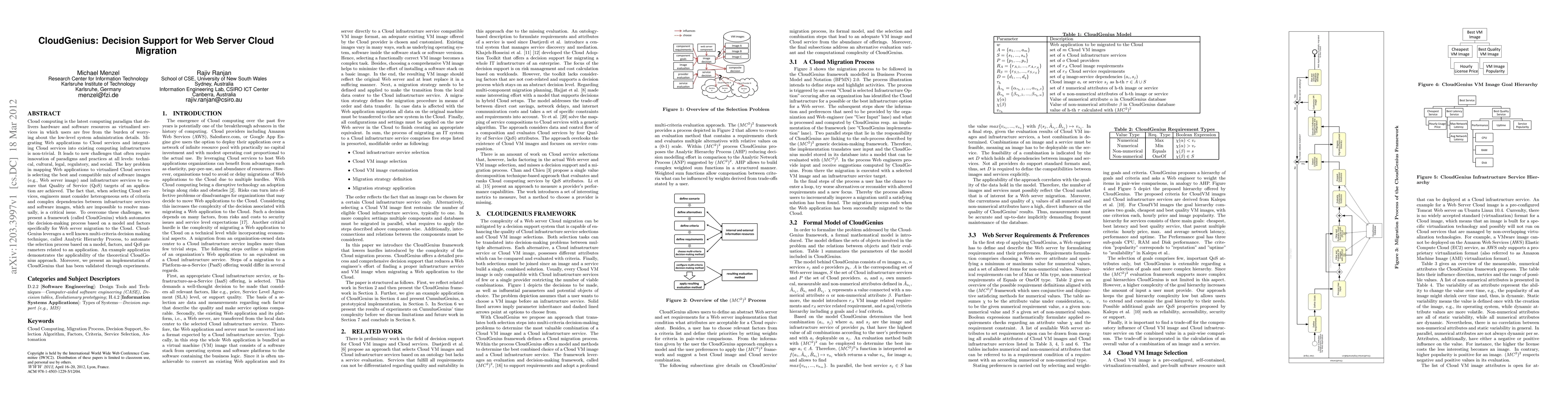 CloudGenius is a framework that automates the decision-making process for migrating Web applications to Cloud services using the Analytic Hierarchy Process. It addresses the complex criteria and dependencies involved in selecting the optimal mix of software images and infrastructure services to meet Quality of Service targets.