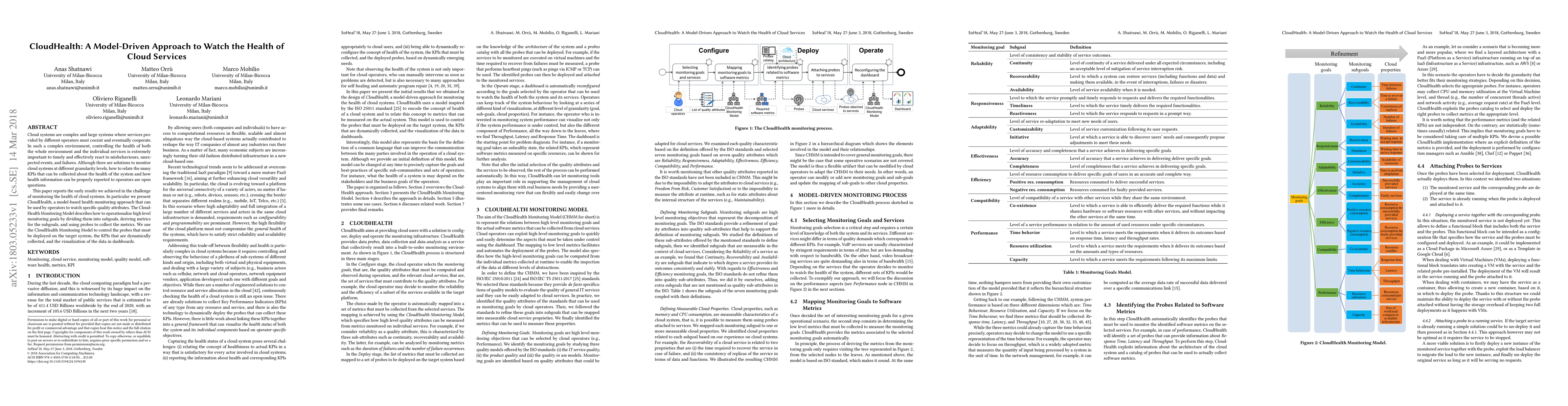 Cloud systems are complex and large systems where services provided by different operators must coexist and eventually cooperate. In such a complex environment, controlling the health of both the whole environment and the individual services is extremely important to timely and effectively react to misbehaviours, unexpected events, and failures. Although there are solutions to monitor cloud systems at different granularity levels, how to relate the many KPIs that can be collected about the health of the system and how health information can be properly reported to operators are open questions. This paper reports the early results we achieved in the challenge of monitoring the health of cloud systems. In particular we present CloudHealth, a model-based health monitoring approach that can be used by operators to watch specific quality attributes. The CloudHealth Monitoring Model describes how to operationalize high level monitoring goals by dividing them into subgoals, deriving metrics for the subgoals, and using probes to collect the metrics. We use the CloudHealth Monitoring Model to control the probes that must be deployed on the target system, the KPIs that are dynamically collected, and the visualization of the data in dashboards.