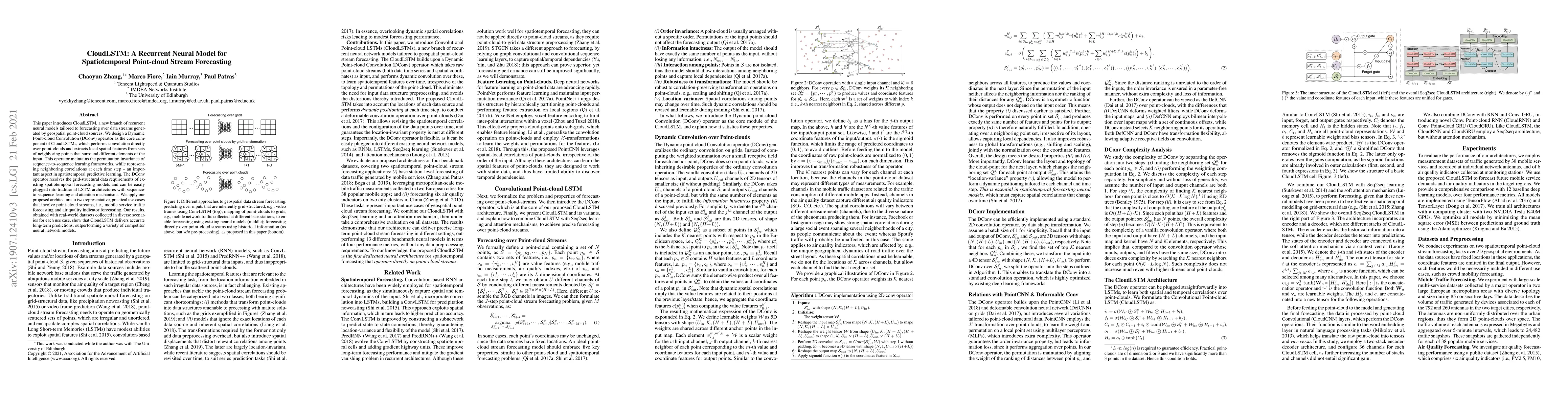This paper introduces CloudLSTM, a new branch of recurrent neural models tailored to forecasting over data streams generated by geospatial point-cloud sources. We design a Dynamic Point-cloud Convolution (DConv) operator as the core component of CloudLSTMs, which performs convolution directly over point-clouds and extracts local spatial features from sets of neighboring points that surround different elements of the input. This operator maintains the permutation invariance of sequence-to-sequence learning frameworks, while representing neighboring correlations at each time step -- an important aspect in spatiotemporal predictive learning. The DConv operator resolves the grid-structural data requirements of existing spatiotemporal forecasting models and can be easily plugged into traditional LSTM architectures with sequence-to-sequence learning and attention mechanisms. We apply our proposed architecture to two representative, practical use cases that involve point-cloud streams, i.e., mobile service traffic forecasting and air quality indicator forecasting. Our results, obtained with real-world datasets collected in diverse scenarios for each use case, show that CloudLSTM delivers accurate long-term predictions, outperforming a variety of competitor neural network models.
