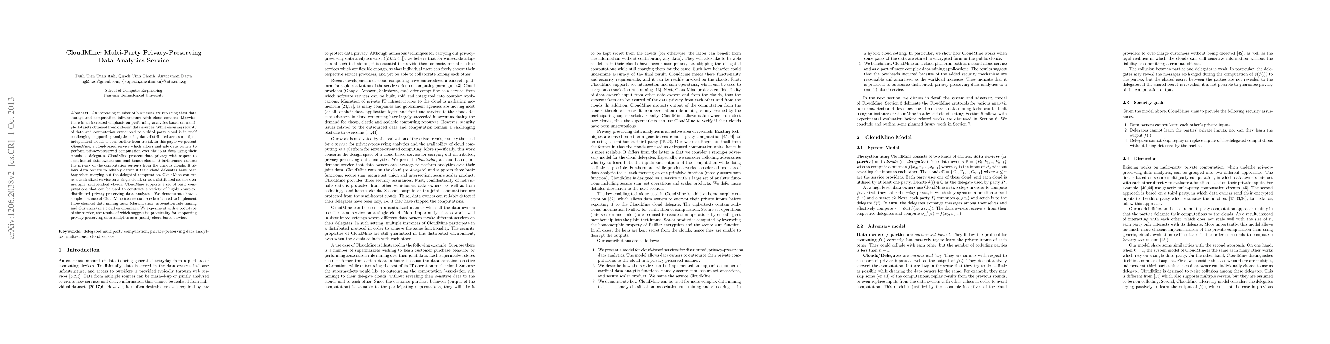 CloudMine is a privacy-preserving data analytics service enabling multiple data owners to securely compute over shared data across independent clouds, ensuring data and computation privacy, and detecting cloud delegate laziness. The service supports basic computations for complex data analytics and demonstrates practical implementation through a prototype.