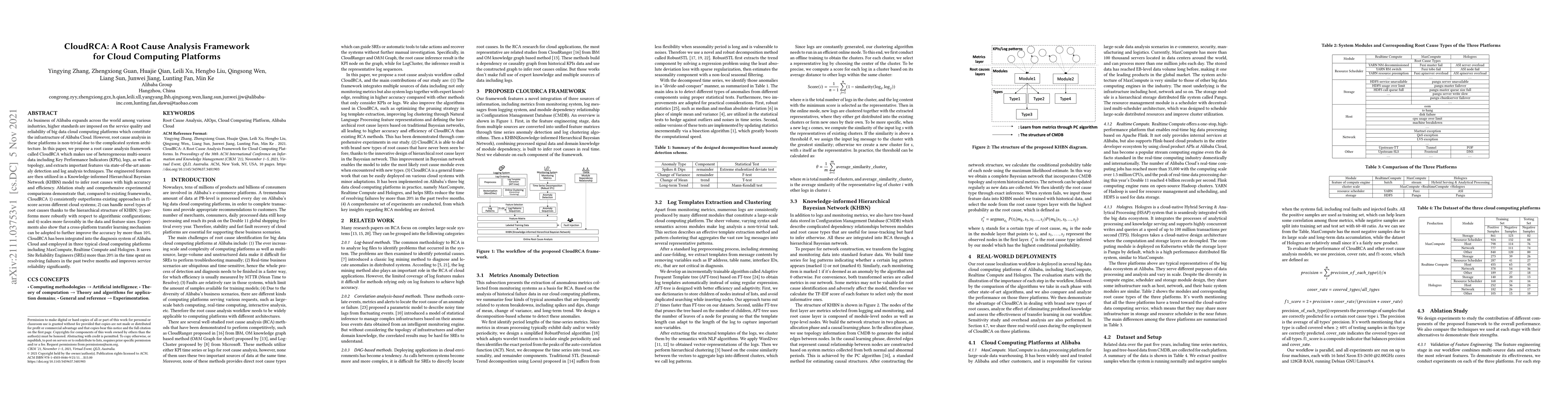 CloudRCA is a proposed root cause analysis framework for Alibaba Cloud's big data platforms, leveraging multi-source data and advanced anomaly detection to identify root causes efficiently. It outperforms existing methods in accuracy and scalability, significantly reducing the time spent by Site Reliability Engineers in failure resolution.