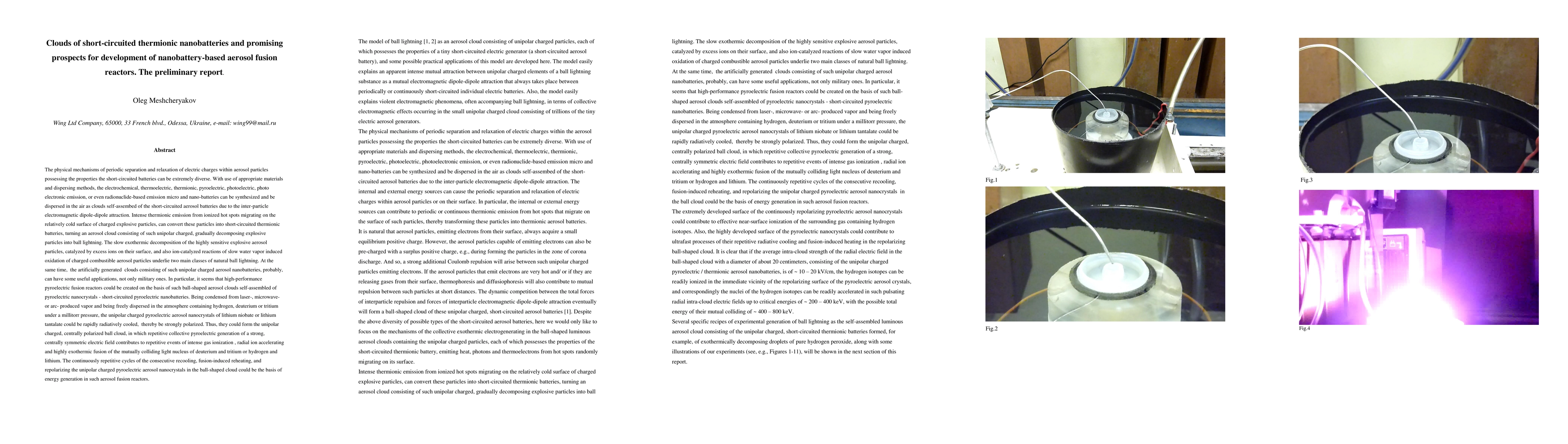 The physical mechanisms of periodic separation and relaxation of electric charges within aerosol particles possessing the properties the short-circuited batteries can be extremely diverse. With use of appropriate materials and dispersing methods, the electrochemical, thermoelectric, thermionic, pyroelectric, photoelectric, photo electronic emission, or even radionuclide-based emission micro and nano-batteries can be synthesized and be dispersed in the air as clouds self-assembed of the short-circuited aerosol batteries due to the inter-particle electromagnetic dipole-dipole attraction. Intense thermionic emission from ionized hot spots migrating on the relatively cold surface of charged explosive particles, can convert these particles into short-circuited thermionic batteries, turning an aerosol cloud consisting of such unipolar charged, gradually decomposing explosive particles into ball lightning. The slow exothermic decomposition of the highly sensitive explosive aerosol particles, catalyzed by excess ions on their surface, and also ion-catalyzed reactions of slow water vapor induced oxidation of charged combustible aerosol particles underlie two main classes of natural ball lightning. At the same time, the artificially generated clouds consisting of such unipolar charged aerosol nanobatteries, probably, can have some useful applications, not only military ones. In particular, it seems that high-performance pyroelectric fusion reactors could be created on the basis of such ball-shaped aerosol clouds self-assembled of pyroelectric nanocrystals - short-circuited pyroelectric nanobatteries.