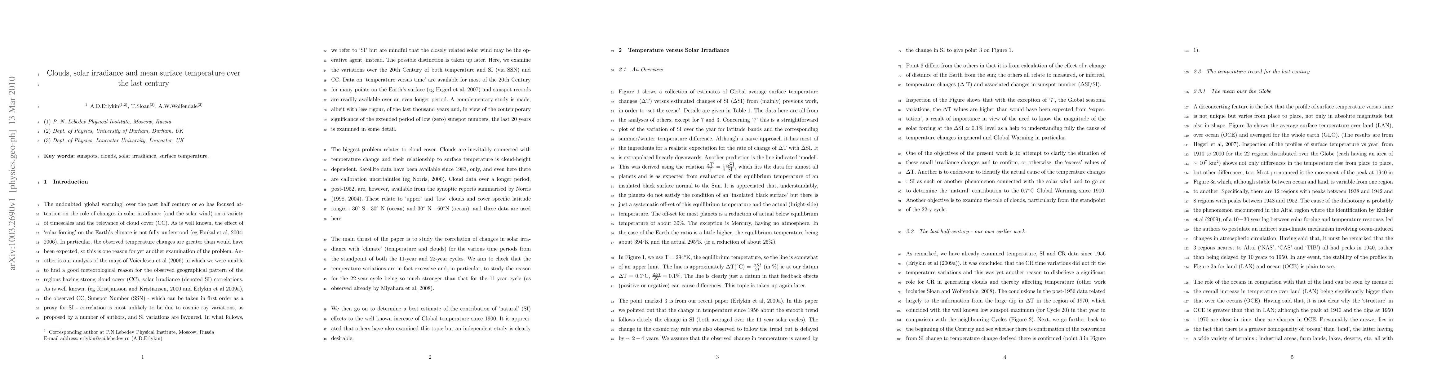 The inter-relation of clouds, solar irradiance and surface temperature is complex and subject to different interpretations. Here, we continue our recent work, which related mainly to the period from 1960 to the present, back to 1900 with further, but less detailed, analysis of the last 1000 years. The last 20 years is examined especially. Attention is given to the mean surface temperature, solar irradiance correlation, which appears to be present (with decadal smoothing) with a 22-year period; it is stronger than the 11-year cycle correlation with one year resolution. UV in the solar radiation is a likely cause. Cloud data are taken from synoptic observations back to 1952 and, again, there appears to be a correlation - with opposite phase for high and low clouds - at the 20-30y level. Particular attention is devoted to answering the question, 'what fraction of the observed increase in mean Global temperature (~0.7^oC) can be attributed to solar, as distinct from man-made, effects?' We conclude that a best estimate is 'essentially' all from 1900 to 1956 and <14% from 1956 to the present.