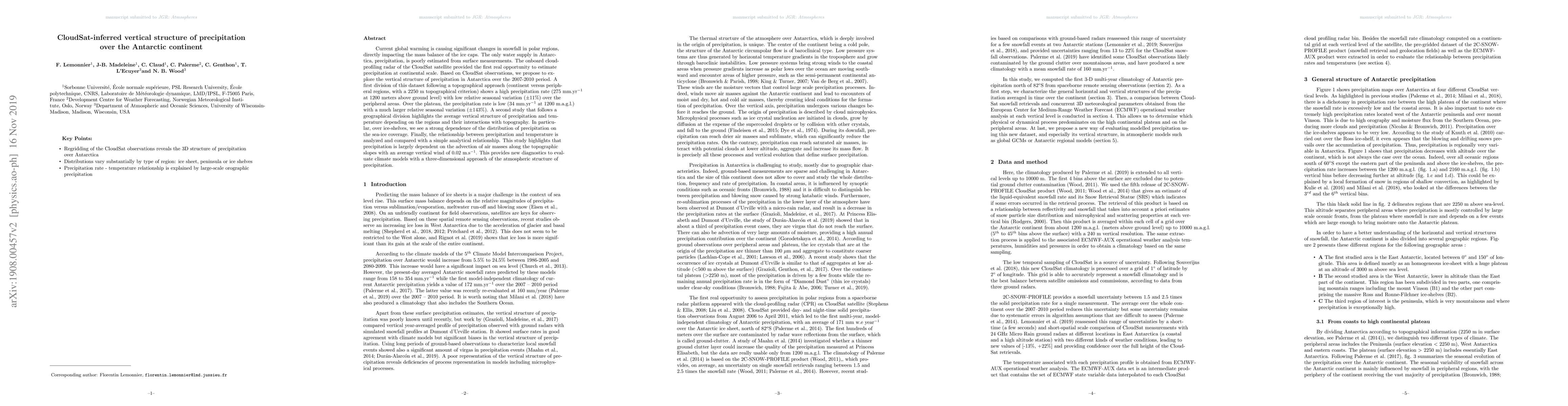 This study uses CloudSat satellite data to estimate precipitation over Antarctica, finding high rates in peripheral areas and low rates on the plateau, with varying seasonal patterns depending on topography.