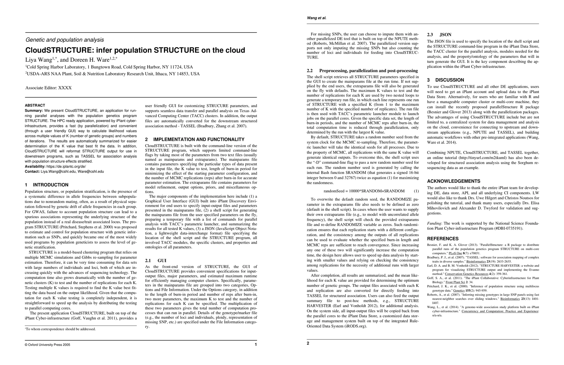 We present CloudSTRUCTURE, an application for running parallel analyses with the population genetics program STRUCTURE. The HPC ready application, powered by iPlant cyber-infrastructure, provides a fast (by parallelization) and convenient (through a user friendly GUI) way to calculate like-lihood values across multiple values of K (number of genetic groups) and numbers of iterations. The results are automati-cally summarized for easier determination of the K value that best fit the data. In addition, CloudSTRUCTURE will reformat STRUCTURE output for use in downstream programs, such as TASSEL for association analysis with population structure ef-fects stratified.