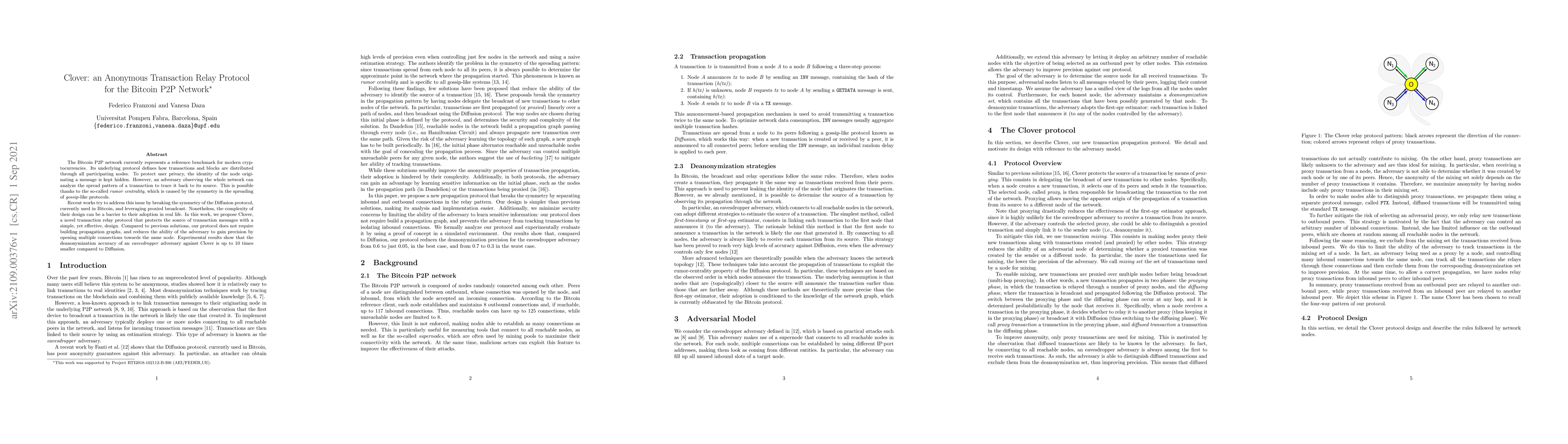 Clover proposes a simple yet effective transaction relay protocol to protect user privacy in Bitcoin's P2P network, reducing deanonymization accuracy by up to 10 times compared to existing solutions.