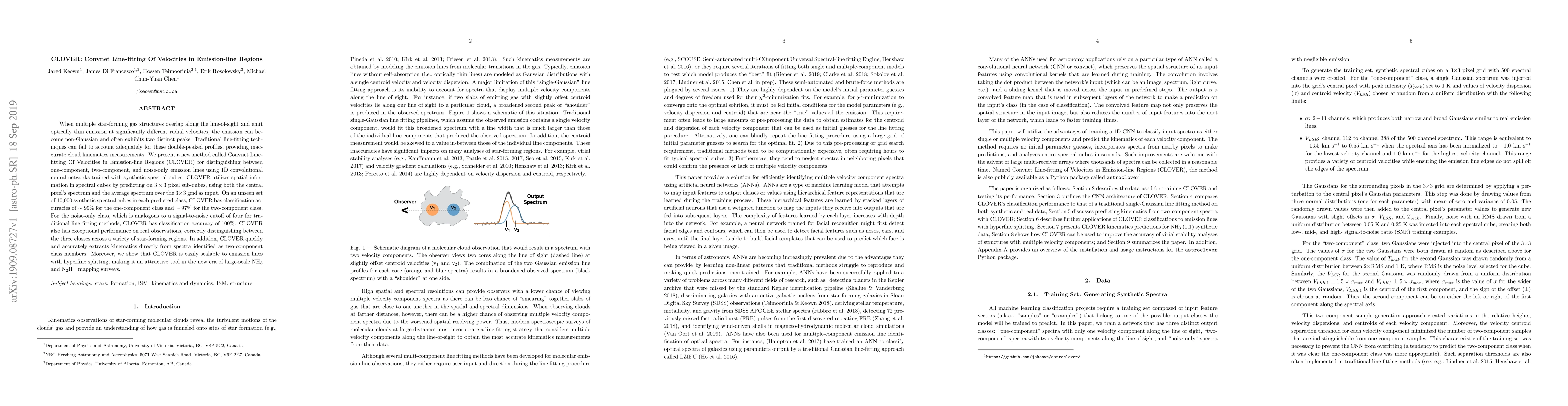 When multiple star-forming gas structures overlap along the line-of-sight and emit optically thin emission at significantly different radial velocities, the emission can become non-Gaussian and often exhibits two distinct peaks. Traditional line-fitting techniques can fail to account adequately for these double-peaked profiles, providing inaccurate cloud kinematics measurements. We present a new method called Convnet Line-fitting Of Velocities in Emission-line Regions (CLOVER) for distinguishing between one-component, two-component, and noise-only emission lines using 1D convolutional neural networks trained with synthetic spectral cubes. CLOVER utilizes spatial information in spectral cubes by predicting on $3\times3$ pixel sub-cubes, using both the central pixel's spectrum and the average spectrum over the $3\times3$ grid as input. On an unseen set of 10,000 synthetic spectral cubes in each predicted class, CLOVER has classification accuracies of $\sim99\%$ for the one-component class and $\sim97\%$ for the two-component class. For the noise-only class, which is analogous to a signal-to-noise cutoff of four for traditional line-fitting methods, CLOVER has classification accuracy of $100\%$. CLOVER also has exceptional performance on real observations, correctly distinguishing between the three classes across a variety of star-forming regions. In addition, CLOVER quickly and accurately extracts kinematics directly from spectra identified as two-component class members. Moreover, we show that CLOVER is easily scalable to emission lines with hyperfine splitting, making it an attractive tool in the new era of large-scale NH$_3$ and N$_2$H$^+$ mapping surveys.