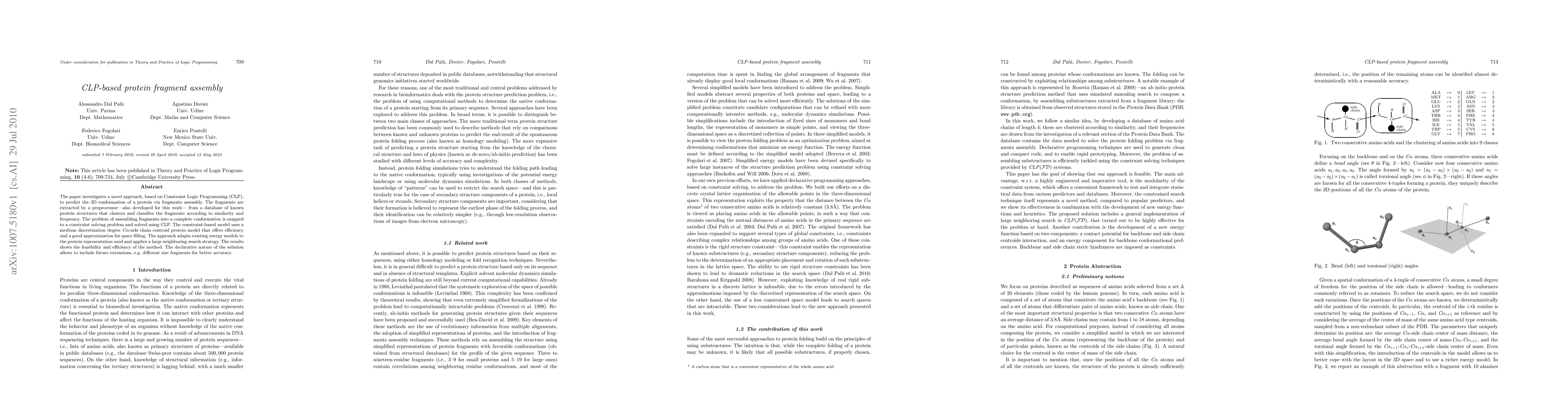 The paper investigates a novel approach, based on Constraint Logic Programming (CLP), to predict the 3D conformation of a protein via fragments assembly. The fragments are extracted by a preprocessor-also developed for this work- from a database of known protein structures that clusters and classifies the fragments according to similarity and frequency. The problem of assembling fragments into a complete conformation is mapped to a constraint solving problem and solved using CLP. The constraint-based model uses a medium discretization degree Ca-side chain centroid protein model that offers efficiency and a good approximation for space filling. The approach adapts existing energy models to the protein representation used and applies a large neighboring search strategy. The results shows the feasibility and efficiency of the method. The declarative nature of the solution allows to include future extensions, e.g., different size fragments for better accuracy.
