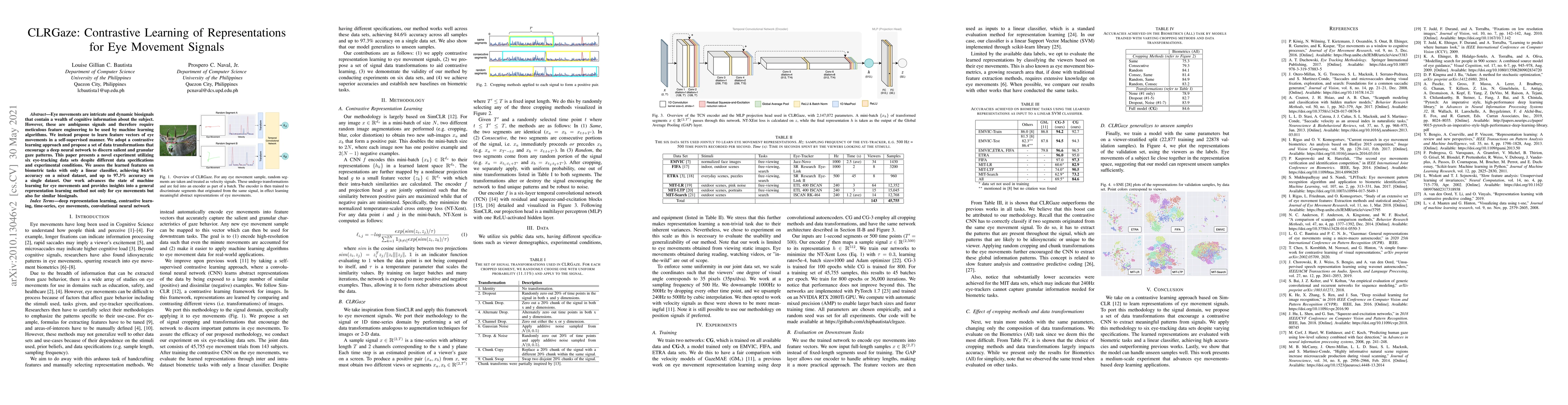 Eye movements are intricate and dynamic biosignals that contain a wealth of cognitive information about the subject. However, these are ambiguous signals and therefore require meticulous feature engineering to be used by machine learning algorithms. We instead propose to learn feature vectors of eye movements in a self-supervised manner. We adopt a contrastive learning approach and propose a set of data transformations that encourage a deep neural network to discern salient and granular gaze patterns. This paper presents a novel experiment utilizing six eye-tracking data sets despite different data specifications and experimental conditions. We assess the learned features on biometric tasks with only a linear classifier, achieving 84.6% accuracy on a mixed dataset, and up to 97.3% accuracy on a single dataset. Our work advances the state of machine learning for eye movements and provides insights into a general representation learning method not only for eye movements but also for similar biosignals.