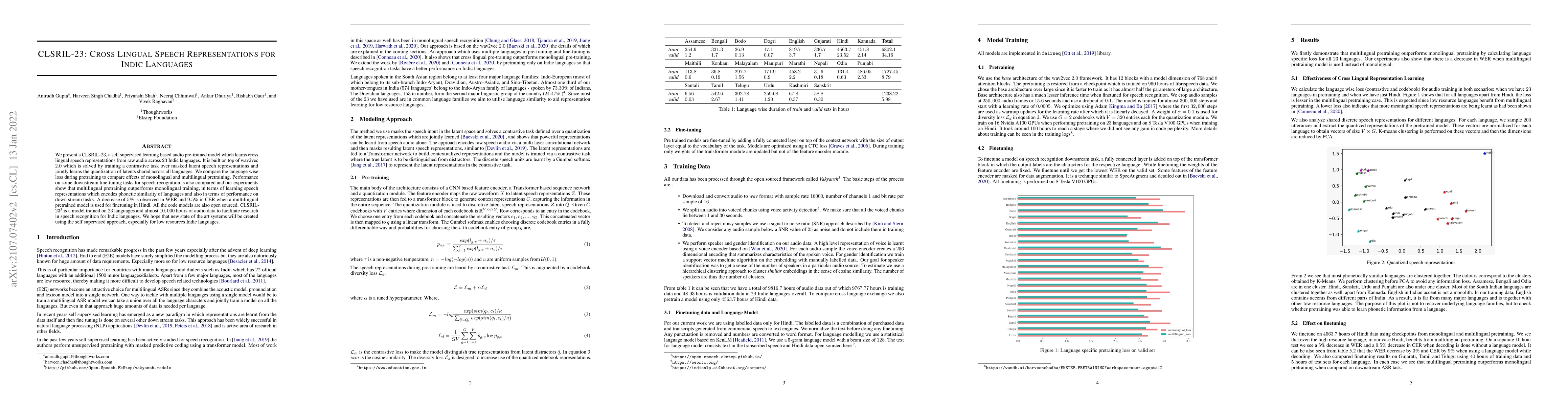 CLSRIL-23 is a self-supervised learning model for cross-lingual speech representations across 23 Indic languages, showing improved performance over monolingual training in speech recognition tasks, with a 5% reduction in WER and 9.5% in CER for Hindi. The model is built on wav2vec 2.0 and its code is open-sourced.
