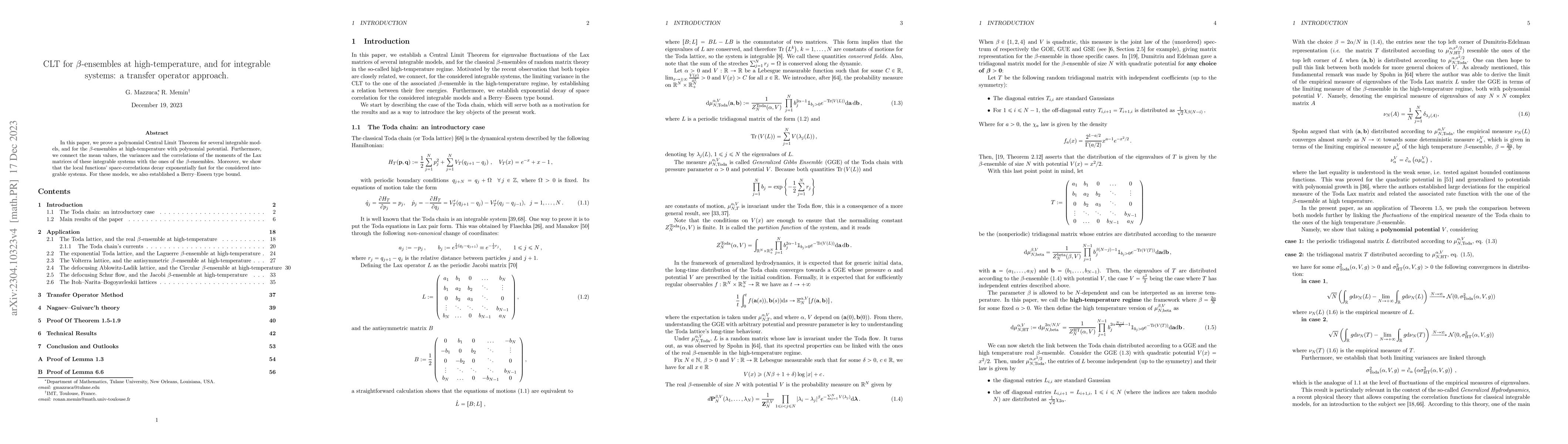 In this paper, we prove a polynomial Central Limit Theorem for several integrable models, and for the $\beta$-ensembles at high-temperature with polynomial potential. Furthermore, we connect the mean values, the variances and the correlations of the moments of the Lax matrices of these integrable systems with the ones of the $\beta$-ensembles. Moreover, we show that the local functions' space-correlations decay exponentially fast for the considered integrable systems. For these models, we also established a Berry--Esseen type bound.
