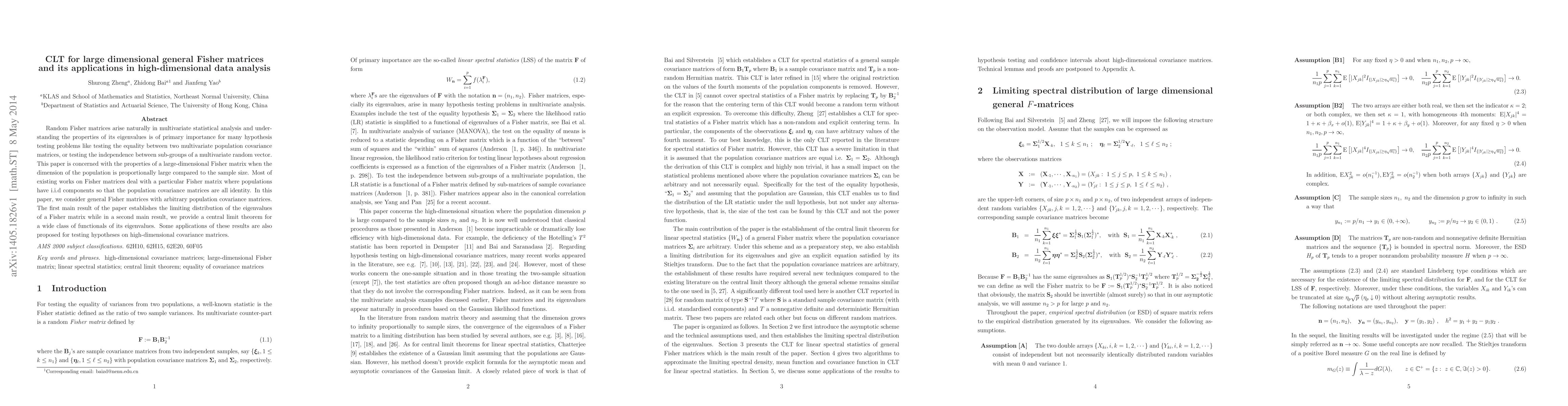 This paper explores the limiting distribution and central limit theorem (CLT) for large-dimensional general Fisher matrices, extending beyond the i.i.d. assumption to arbitrary covariance matrices. It proposes applications for hypothesis testing in high-dimensional data analysis.