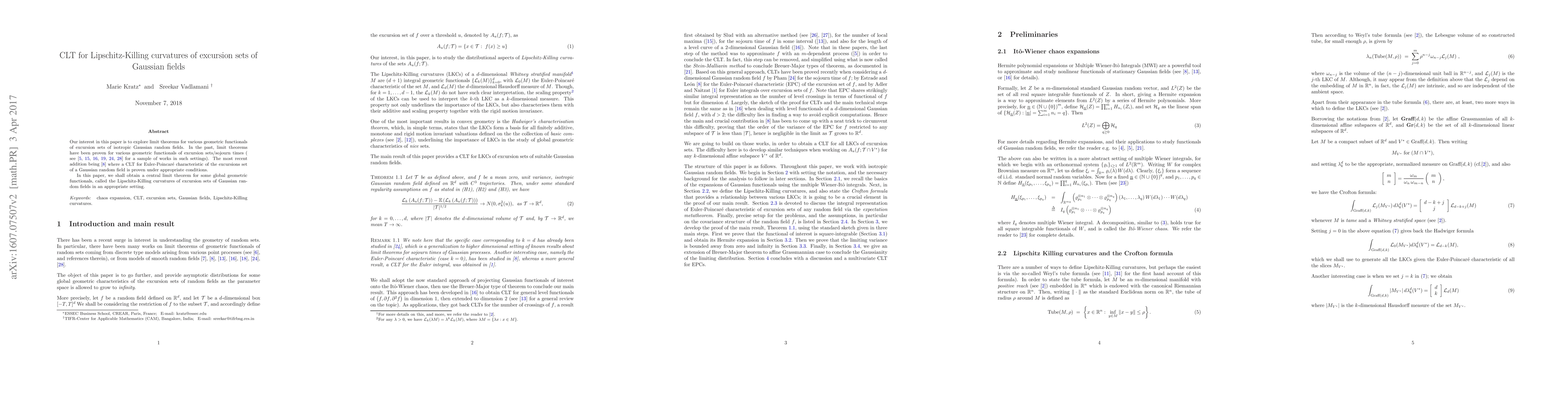 This paper investigates limit theorems for geometric functionals of excursion sets from isotropic Gaussian random fields, specifically focusing on deriving a central limit theorem for Lipschitz-Killing curvatures under suitable conditions. Previous work has established CLTs for various geometric properties of these sets.