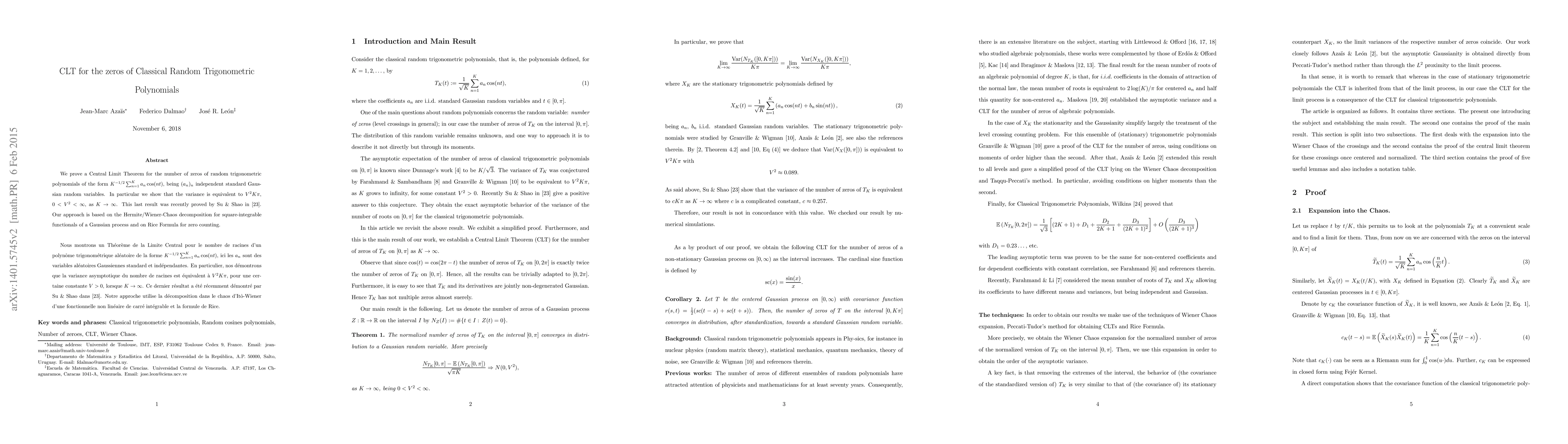 This paper establishes a Central Limit Theorem for the zeros of classical random trigonometric polynomials, showing that their variance approaches $V^2K$ as the number of terms increases, validating a conjecture by Farahmand, Granville, and Wigman. The proof leverages Hermite/Wiener-Chaos decomposition and Rice Formula for zero counting.