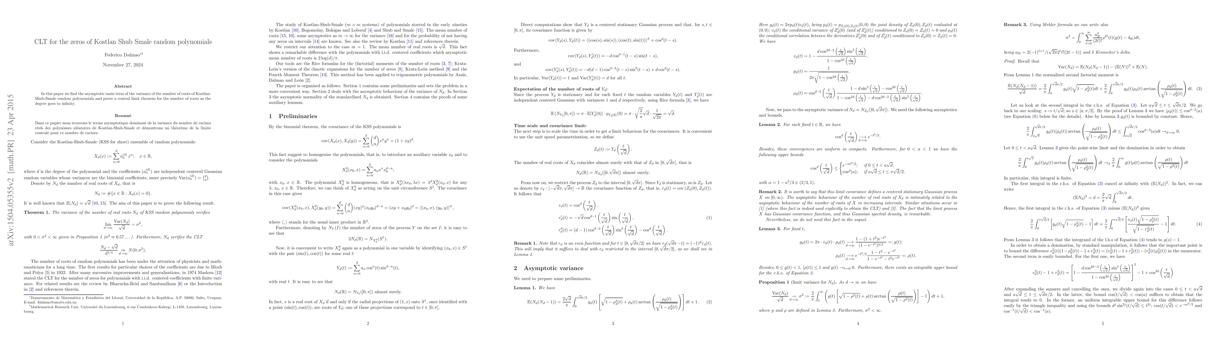 The paper determines the leading term in the variance of the root count for Kostlan-Shub-Smale random polynomials and establishes a central limit theorem for the root count as the degree approaches infinity.