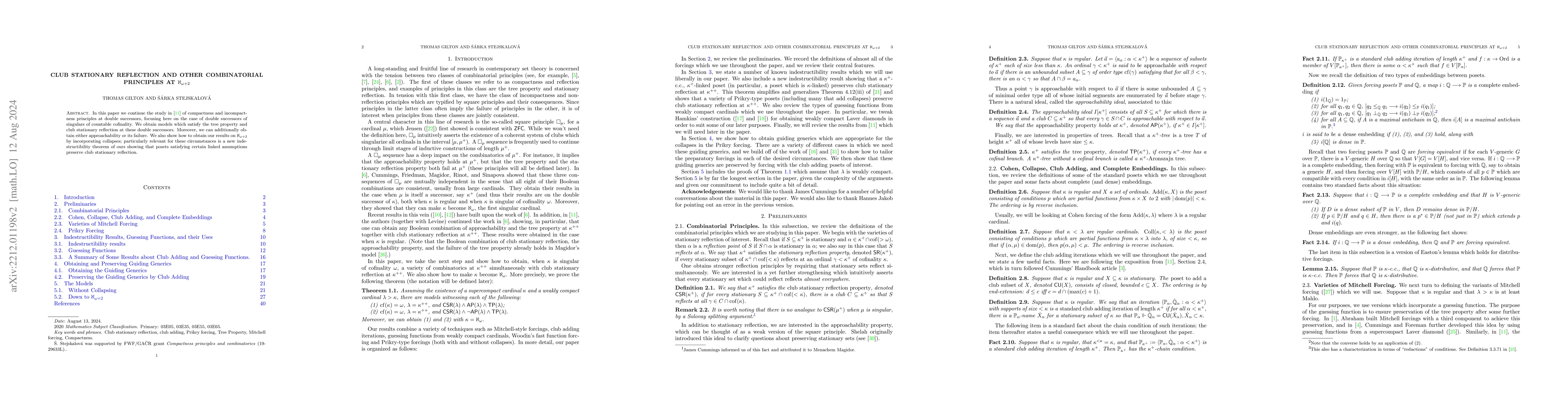 This paper explores combinatorial principles at $\aleph_{\omega+2}$, focusing on double successors of singular cardinals with countable cofinality. It constructs models that satisfy the tree property and club stationary reflection, and can additionally achieve either approachability or its failure, utilizing collapses and a new indestructibility theorem for posets.