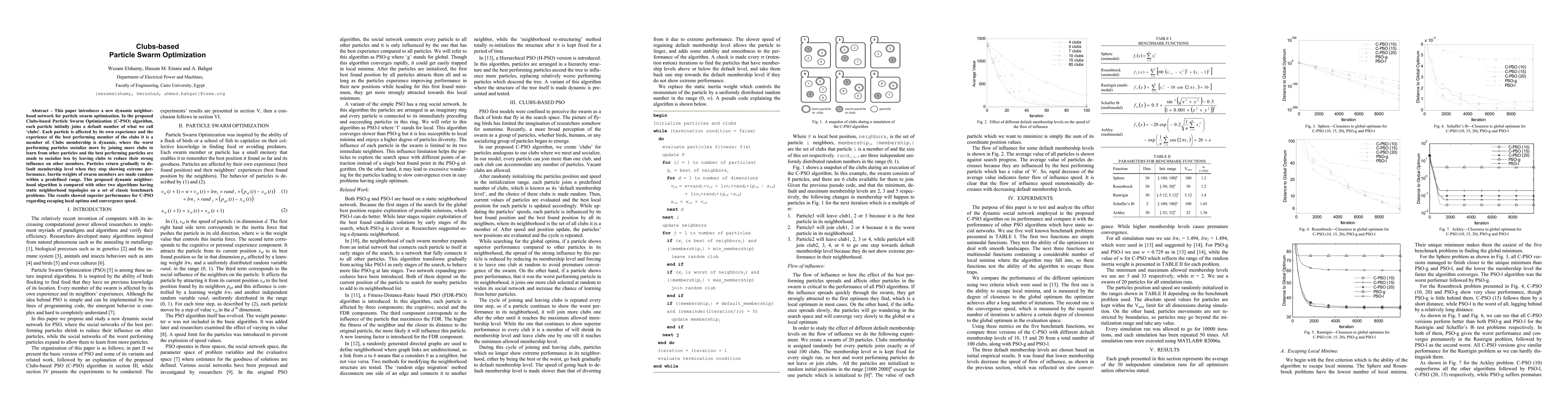 The Clubs-based Particle Swarm Optimization (C-PSO) algorithm introduces a dynamic neighborhood network where particles join 'clubs' and are influenced by their own experience and the best club members. Dynamic club membership adjusts based on particle performance, enhancing socialization for underperforming particles and reducing it for top performers. The algorithm shows superior performance compared to static neighborhood algorithms in benchmark tests.