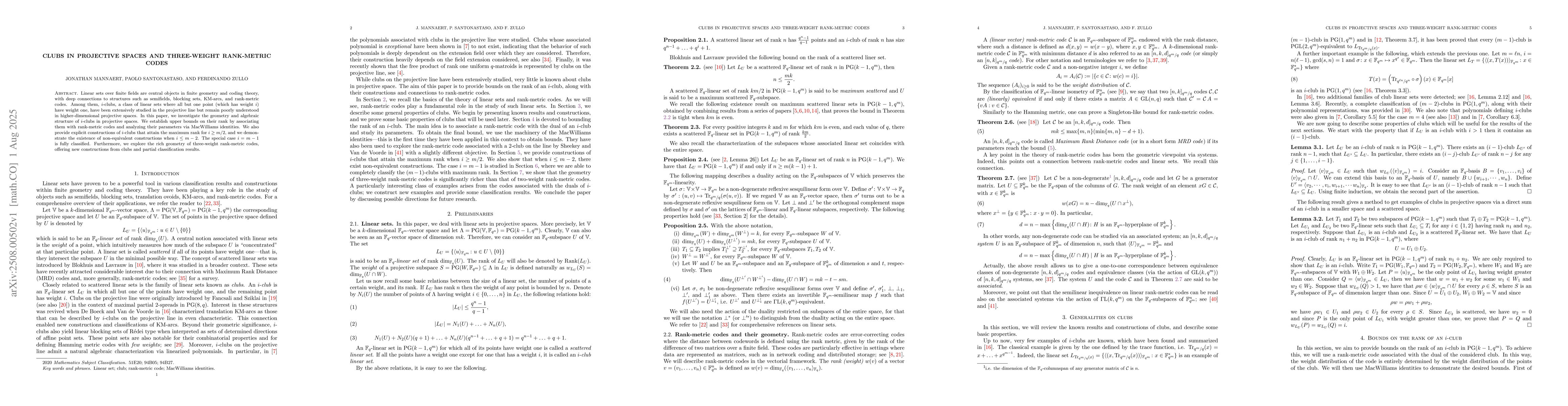 Linear sets over finite fields are central objects in finite geometry and coding theory, with deep connections to structures such as semifields, blocking sets, KM-arcs, and rank-metric codes. Among them, $i$-clubs, a class of linear sets where all but one point (which has weight $i$) have weight one, have been extensively studied in the projective line but remain poorly understood in higher-dimensional projective spaces. In this paper, we investigate the geometry and algebraic structure of $i$-clubs in projective spaces. We establish upper bounds on their rank by associating them with rank-metric codes and analyzing their parameters via MacWilliams identities. We also provide explicit constructions of $i$-clubs that attain the maximum rank for $i \geq m/2$, and we demonstrate the existence of non-equivalent constructions when $i \leq m-2$. The special case $i = m-1$ is fully classified. Furthermore, we explore the rich geometry of three-weight rank-metric codes, offering new constructions from clubs and partial classification results.