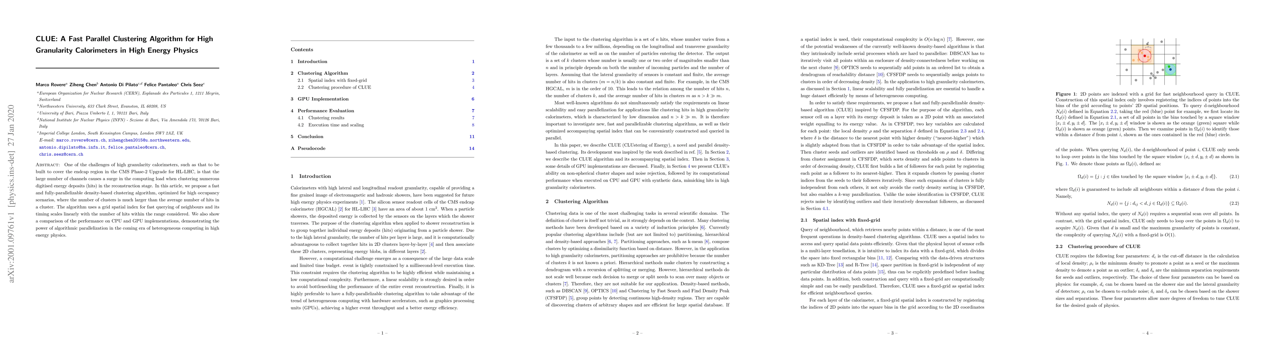 The primary technical contribution is the development of the CLUE algorithm, which efficiently clusters hits in high granularity calorimeters using density-based principles and parallel processing techniques, optimized for both CPU and GPU architectures.