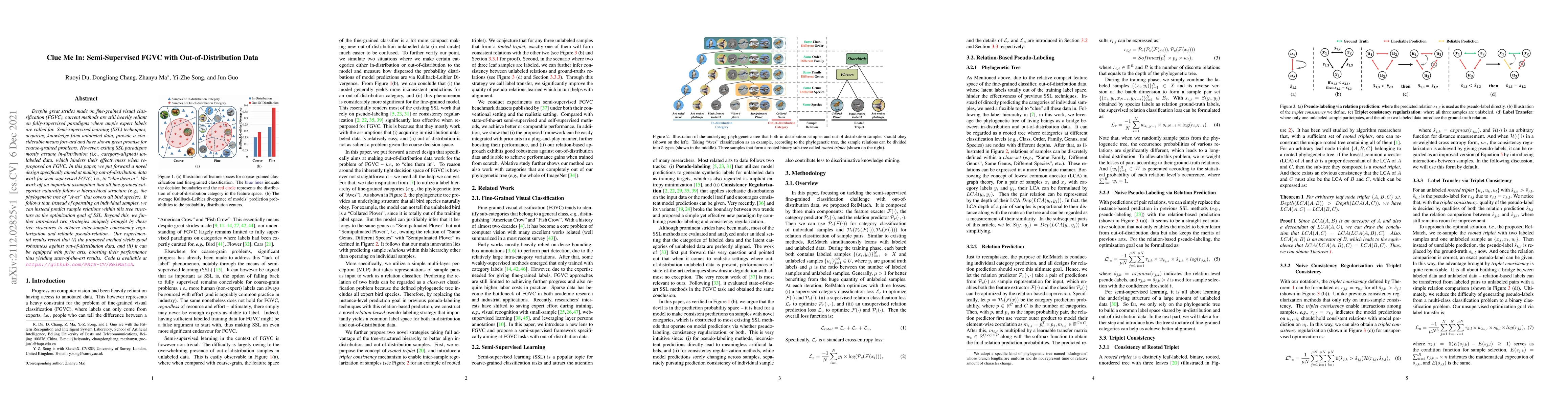 Despite great strides made on fine-grained visual classification (FGVC), current methods are still heavily reliant on fully-supervised paradigms where ample expert labels are called for. Semi-supervised learning (SSL) techniques, acquiring knowledge from unlabeled data, provide a considerable means forward and have shown great promise for coarse-grained problems. However, exiting SSL paradigms mostly assume in-distribution (i.e., category-aligned) unlabeled data, which hinders their effectiveness when re-proposed on FGVC. In this paper, we put forward a novel design specifically aimed at making out-of-distribution data work for semi-supervised FGVC, i.e., to "clue them in". We work off an important assumption that all fine-grained categories naturally follow a hierarchical structure (e.g., the phylogenetic tree of "Aves" that covers all bird species). It follows that, instead of operating on individual samples, we can instead predict sample relations within this tree structure as the optimization goal of SSL. Beyond this, we further introduced two strategies uniquely brought by these tree structures to achieve inter-sample consistency regularization and reliable pseudo-relation. Our experimental results reveal that (i) the proposed method yields good robustness against out-of-distribution data, and (ii) it can be equipped with prior arts, boosting their performance thus yielding state-of-the-art results. Code is available at https://github.com/PRIS-CV/RelMatch.