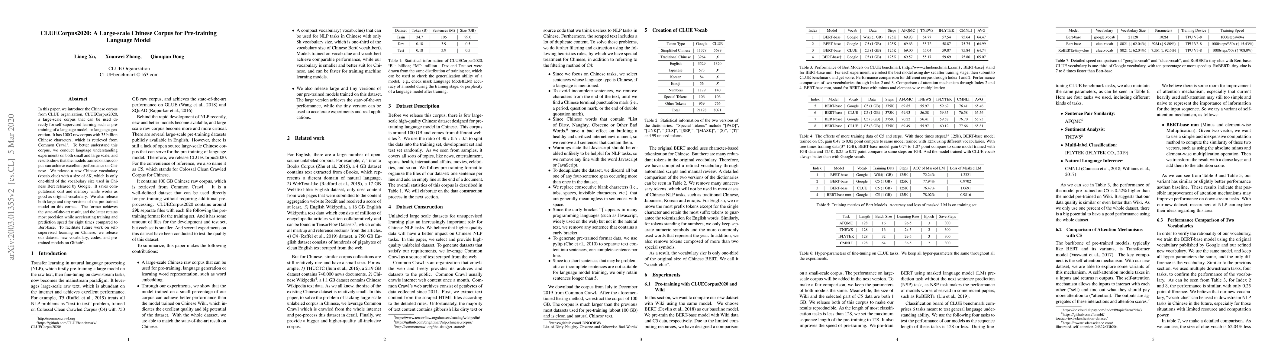 CLUECorpus2020, a large-scale Chinese corpus from the CLUE organization, supports self-supervised learning and pre-training of language models, demonstrating excellent performance in language understanding experiments. The corpus, along with new vocabulary and pre-trained models, is released to facilitate further research in self-supervised learning for Chinese.