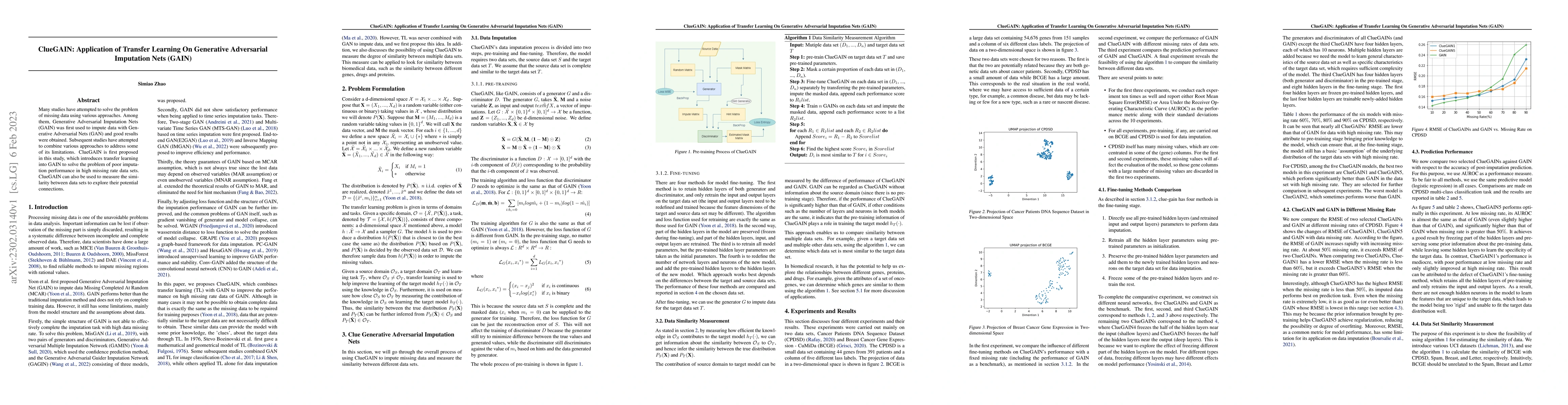 Many studies have attempted to solve the problem of missing data using various approaches. Among them, Generative Adversarial Imputation Nets (GAIN) was first used to impute data with Generative Adversarial Nets (GAN) and good results were obtained. Subsequent studies have attempted to combine various approaches to address some of its limitations. ClueGAIN is first proposed in this study, which introduces transfer learning into GAIN to solve the problem of poor imputation performance in high missing rate data sets. ClueGAIN can also be used to measure the similarity between data sets to explore their potential connections.