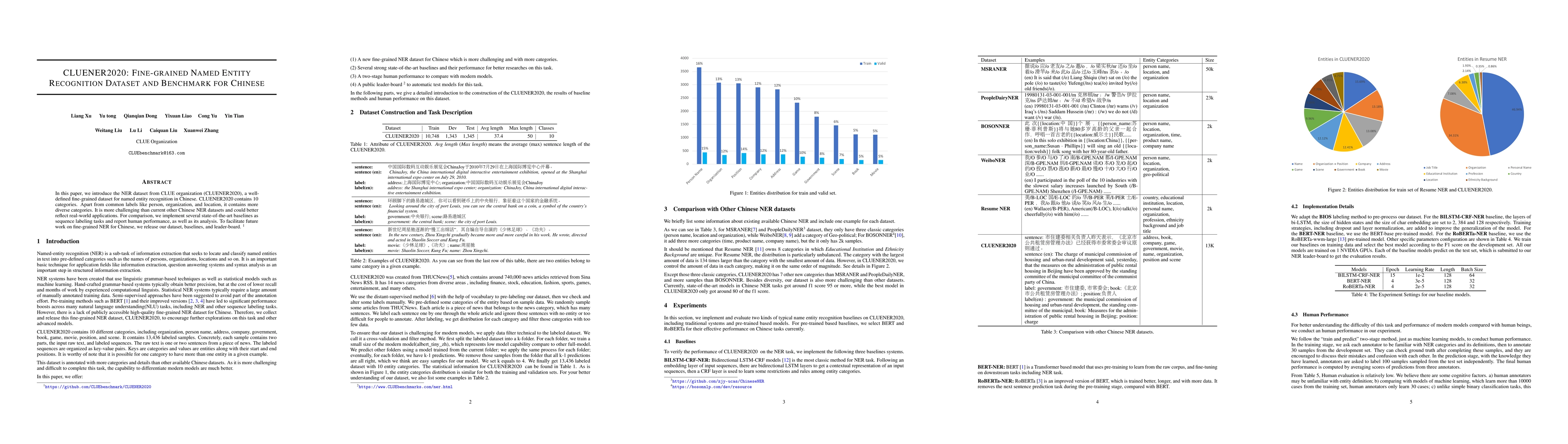 The CLUENER2020 dataset, introduced by the CLUE organization, offers a fine-grained named entity recognition benchmark for Chinese with 10 diverse categories, surpassing current datasets in complexity and realism. Baselines and a leaderboard are released to advance future research in this area.