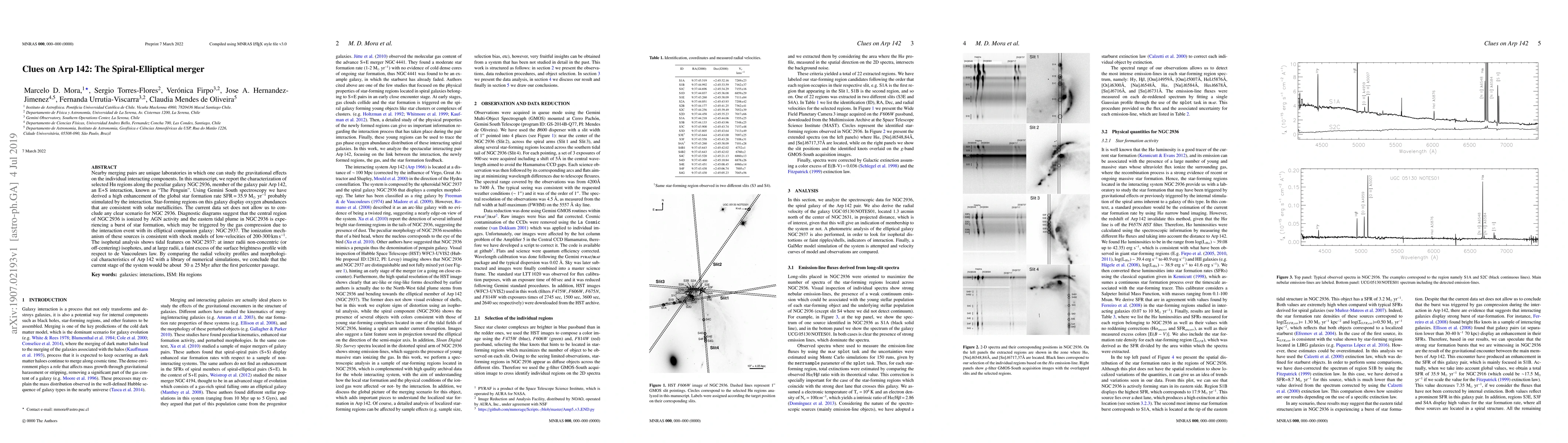 The research on Arp 142, a merging spiral-elliptical galaxy pair, reveals a high star formation rate of 35.9 Msun/yr in NGC 2936, likely due to the interaction. Spectroscopy indicates solar metallicities and AGN activity in the central region, while an eastern tidal plume shows star formation triggered by gas compression. Tidal features in NGC 2937 suggest an off-centering and excess brightness, aligning with a simulation-based conclusion that the system is about 50 +-25 Myr post-first pericenter passage.