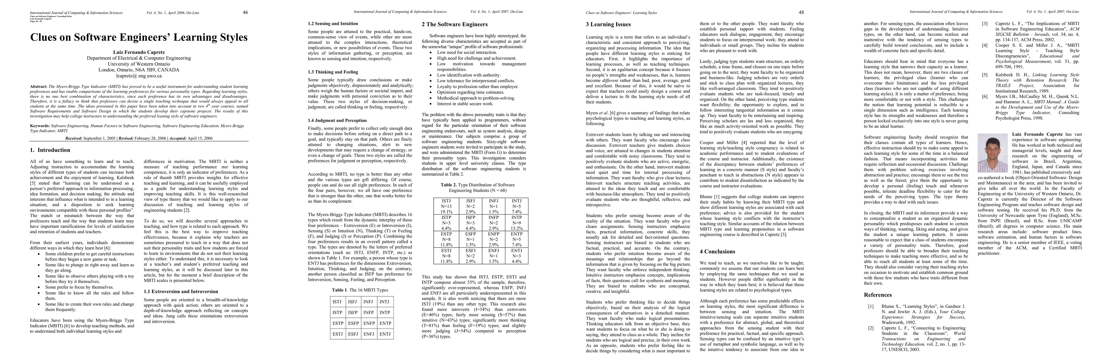 This paper explores the use of the Myers-Briggs Type Indicator (MBTI) to identify software engineers' learning preferences, emphasizing that no single teaching method suits all students. The findings from two 4th-year courses aim to assist college instructors in tailoring their teaching techniques to better meet the diverse learning styles of software engineering students.