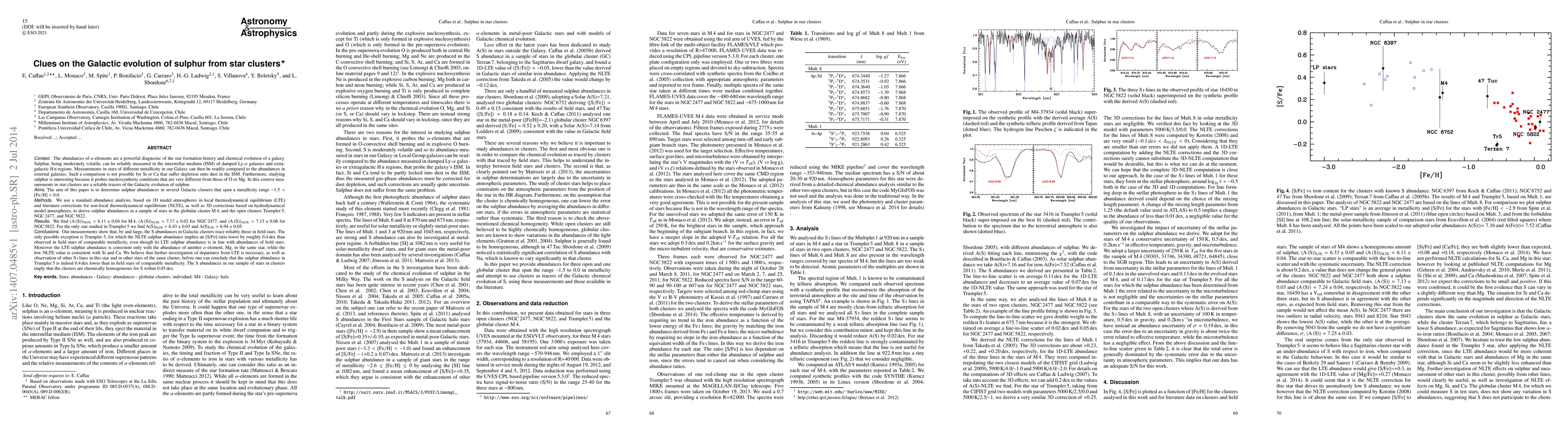 (Abridged) The abundances of alpha-elements are a powerful diagnostic of the star formation history and chemical evolution of a galaxy. Sulphur, being moderately volatile, can be reliably measured in the interstellar medium (ISM) of damped Ly-alpha galaxies and extragalactic HII regions. Measurements in stars of different metallicity in our Galaxy can then be readily compared to the abundances in external galaxies. Such a comparison is not possible for Si or Ca that suffer depletion onto dust in the ISM. Furthermore, studying sulphur is interesting because it probes nucleosynthetic conditions that are very different from those of O or Mg. The measurements in star clusters are a reliable tracers of the Galactic evolution of sulphur. We find NLTE=6.11+/-0.04 for M 4, NLTE=7.17+/-0.02 for NGC 2477, and NLTE=7.13+/-0.06 for NGC 5822. For the only star studied in Trumpler 5 we find A(S)NLTE=6.43+/-0.03 and A(S)LTE=6.94+/-0.05. Our measurements show that, by and large, the S abundances in Galactic clusters trace reliably those in field stars. The only possible exception is Trumpler 5, for which the NLTE sulphur abundance implies an [S/Fe] ratio lower by roughly 0.4 dex than observed in field stars of comparable metallicity, even though its LTE sulphur abundance is in line with abundances of field stars. Moreover the LTE sulphur abundance is consistent only with the abundance of another alpha-element, Mg, in the same star, while the low NLTE value is consistent with Si and Ca. The S abundances in our sample of stars in clusters imply that the clusters are chemically homogeneous for S within 0.05 dex.