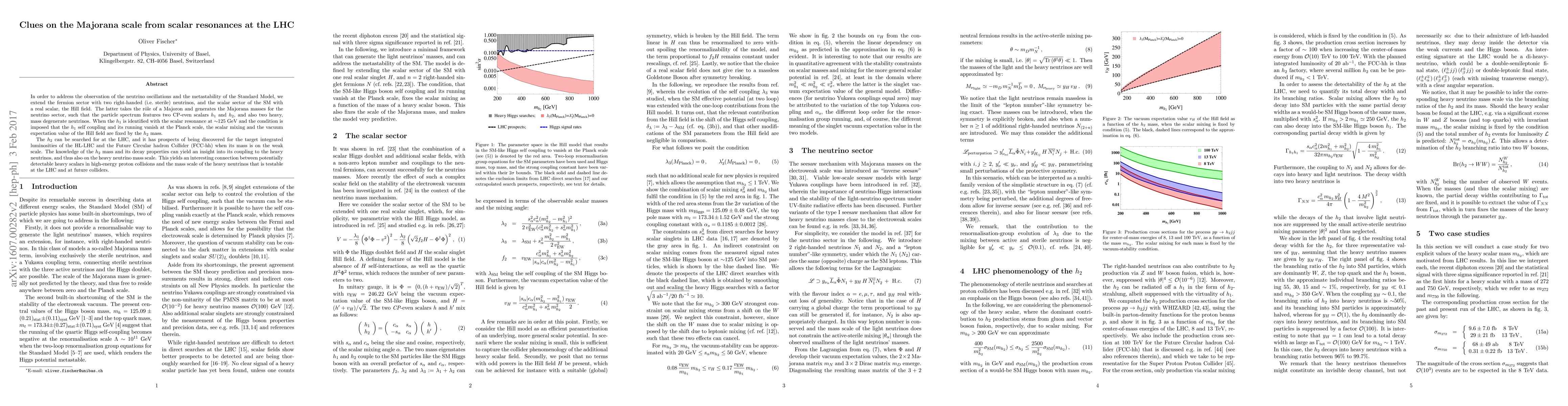 In order to address the observation of the neutrino oscillations and the metastability of the Standard Model, we extend the fermion sector with two right-handed (i.e. sterile) neutrinos, and the scalar sector of the SM with a real scalar, the Hill field. The latter takes the role of a Majoron and generates the Majorana masses for the neutrino sector, such that the particle spectrum features two CP-even scalars $h_1$ and $h_2$, and also two heavy, mass degenerate neutrinos. When the $h_1$ is identified with the scalar resonance at ~125 GeV and the condition is imposed that the $h_1$ self coupling and its running vanish at the Planck scale, the scalar mixing and the vacuum expectation value of the Hill field are fixed by the $h_2$ mass. The $h_2$ can be searched for at the LHC, and it has prospects of being discovered for the target integrated luminosities of the HL-LHC and the Future Circular hadron Collider (FCC-hh) when its mass is on the weak scale. The knowledge of the $h_2$ mass and its decay properties can yield an insight into its coupling to the heavy neutrinos, and thus also on the heavy neutrino mass scale. This yields an interesting connection between potentially detectable heavy scalars in high-energy proton collisions and the mass scale of the heavy neutrinos that is testable at the LHC and at future colliders.