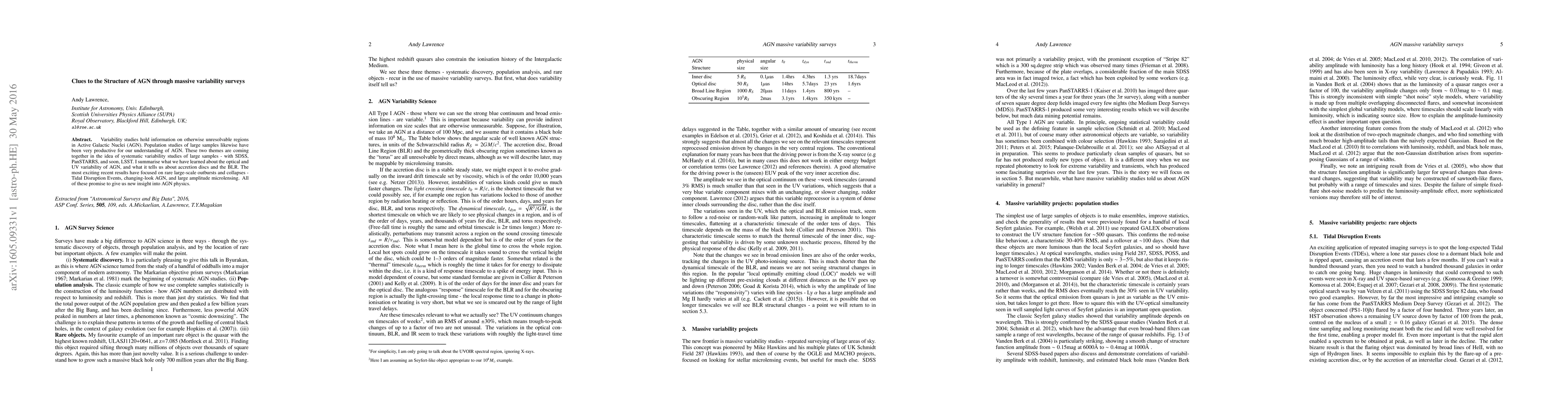 This paper reviews how large-scale variability surveys, such as those conducted by SDSS and PanSTARRS, provide insights into the structure and behavior of Active Galactic Nuclei (AGN). It highlights recent findings on rare phenomena like Tidal Disruption Events and changing-look AGN, which offer new perspectives on AGN physics, particularly regarding accretion discs and the Broad Line Region.