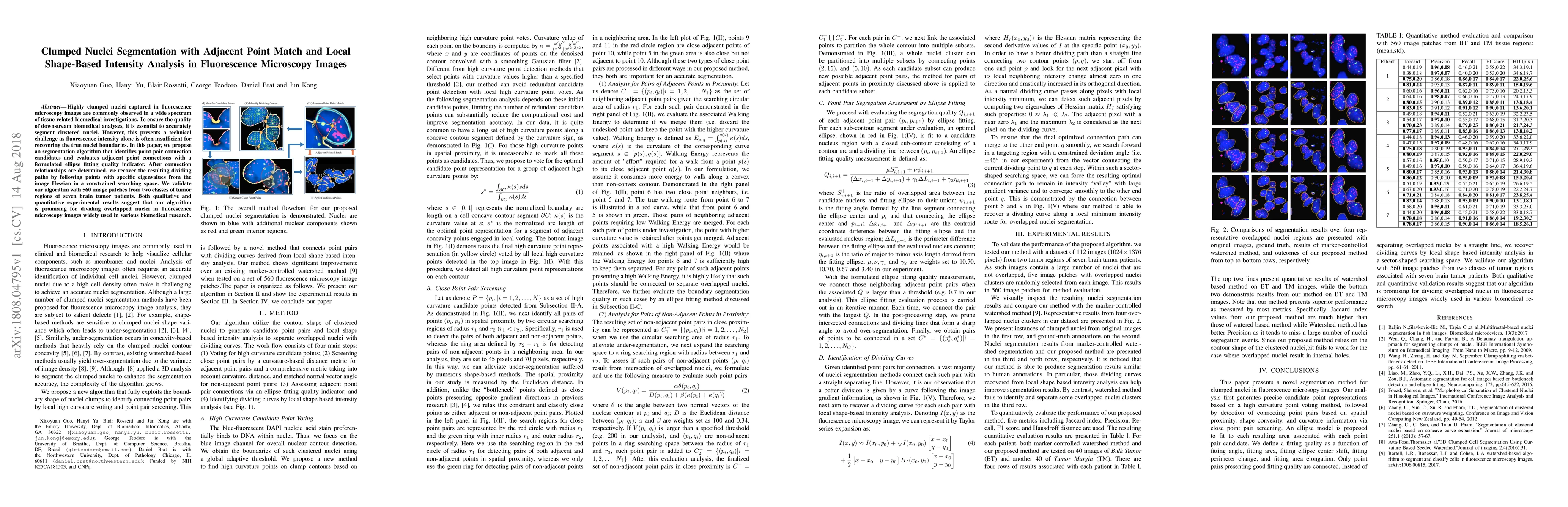 Highly clumped nuclei clusters captured in fluorescence in situ hybridization microscopy images are common histology entities under investigations in a wide spectrum of tissue-related biomedical investigations. Due to their large scale in presence, computer based image analysis is used to facilitate such analysis with improved analysis efficiency and reproducibility. To ensure the quality of downstream biomedical analyses, it is essential to segment clustered nuclei with high quality. However, this presents a technical challenge commonly encountered in a large number of biomedical research, as nuclei are often overlapped due to a high cell density. In this paper, we propose an segmentation algorithm that identifies point pair connection candidates and evaluates adjacent point connections with a formulated ellipse fitting quality indicator. After connection relationships are determined, we recover the resulting dividing paths by following points with specific eigenvalues from Hessian in a constrained searching space. We validate our algorithm with 560 image patches from two classes of tumor regions of seven brain tumor patients. Both qualitative and quantitative experimental results suggest that our algorithm is promising for dividing overlapped nuclei in fluorescence in situ hybridization microscopy images widely used in various biomedical research.