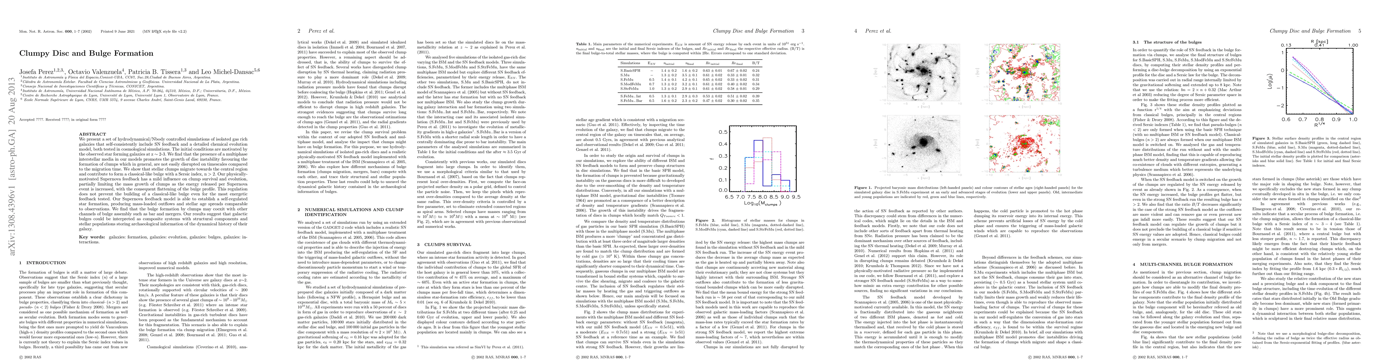 We present a set of hydrodynamical/Nbody controlled simulations of isolated gas rich galaxies that self-consistently include SN feedback and a detailed chemical evolution model, both tested in cosmological simulations. The initial conditions are motivated by the observed star forming galaxies at z ~ 2-3. We find that the presence of a multiphase interstellar media in our models promotes the growth of disc instability favouring the formation of clumps which in general, are not easily disrupted on timescales compared to the migration time. We show that stellar clumps migrate towards the central region and contribute to form a classical-like bulge with a Sersic index, n > 2. Our physically-motivated Supernova feedback has a mild influence on clump survival and evolution, partially limiting the mass growth of clumps as the energy released per Supernova event is increased, with the consequent flattening of the bulge profile. This regulation does not prevent the building of a classical-like bulge even for the most energetic feedback tested. Our Supernova feedback model is able to establish a self-regulated star formation, producing mass-loaded outflows and stellar age spreads comparable to observations. We find that the bulge formation by clumps may coexit with other channels of bulge assembly such as bar and mergers. Our results suggest that galactic bulges could be interpreted as composite systems with structural components and stellar populations storing archaeological information of the dynamical history of their galaxy.