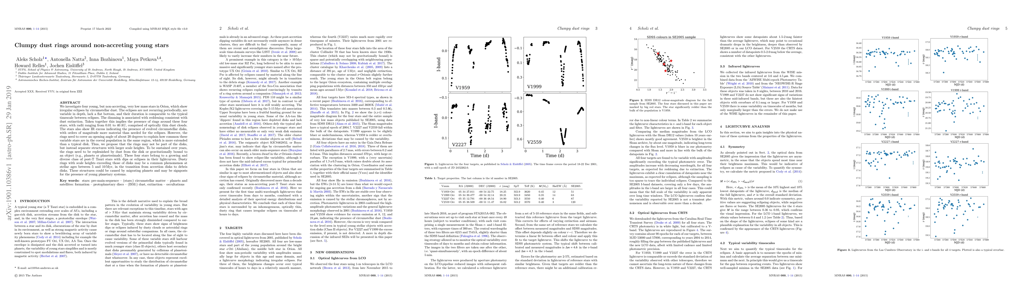This study explores irregular eclipses around four non-accreting young stars in Orion, suggesting the presence of clumpy dust rings with radii ranging from 0.01 to 40 AU. These rings, with larger scale heights than typical disks, may indicate the influence of migrating planets and represent a common phenomenon in the transition from accretion to debris disks.