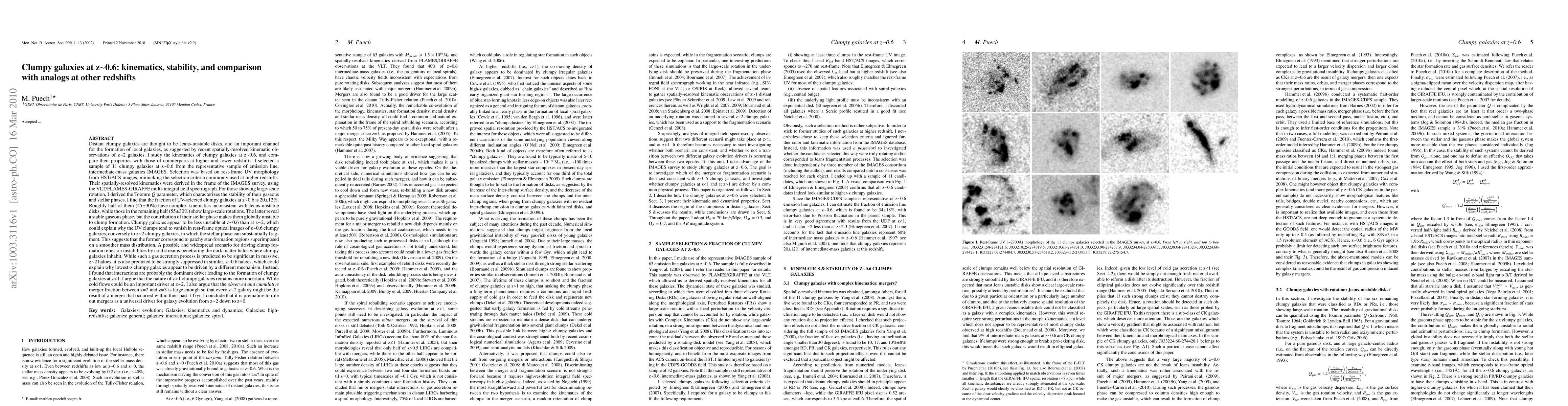 Distant clumpy galaxies are thought to be Jeans-unstable disks, and an important channel for the formation of local galaxies, as suggested by recent spatially-resolved kinematic observations of z~2 galaxies. I study the kinematics of clumpy galaxies at z~0.6, and compare their properties with those of counterparts at higher and lower redshifts. I selected a sample of 11 clumpy galaxies at z~0.6 from the representative sample of emission line, intermediate-mass galaxies IMAGES. Selection was based on rest-frame UV morphology from HST/ACS images, mimicking the selection criteria commonly used at higher redshifts. Their spatially-resolved kinematics were derived in the frame of the IMAGES survey, using the VLT/FLAMES-GIRAFFE multi-integral field spectrograph. For those showing large-scale rotation, I derived the Toomre Q parameter, which characterizes the stability of their gaseous and stellar phases. I find that the fraction of UV-selected clumpy galaxies at z~0.6 is 20+/-12%. Roughly half of them (45+/-30%) have complex kinematics inconsistent with Jeans-unstable disks, while those in the remaining half (55+/-30%) show large-scale rotations. The latter reveal a stable gaseous phase, but the contribution of their stellar phase makes them globally unstable to clump formation. Clumpy galaxies appear to be less unstable at z~0.6 than at z~2, which could explain why the UV clumps tend to vanish in rest-frame optical images of z~0.6 clumpy galaxies, conversely to z~2 clumpy galaxies, in which the stellar phase can substantially fragment. This suggests that the former correspond to patchy star-formation regions superimposed on a smoother mass distribution. A possible and widespread scenario for driving clump formation relies on instabilities by cold streams penetrating the dark matter halos where clumpy galaxies inhabit. While such a gas accretion process is predicted to be significant in massive, z~2 haloes, it is also predicted to be strongly suppressed in similar, z~0.6 haloes, which could explain why lowest-z clumpy galaxies appear to be driven by a different mechanism. Instead, I found that interactions are probably the dominant driver leading to the formation of clumpy galaxies at z<1. I argue that the nature of z>1 clumpy galaxies remains more uncertain. While cold flows could be an important driver at z~2, I also argue that the observed and cumulative merger fraction between z=2 and z=3 is large enough so that every z~2 galaxy might be the result of a merger that occurred within their past 1 Gyr. I conclude that it is premature to rule out mergers as a universal driver for galaxy evolution from z~2 down to z=0.