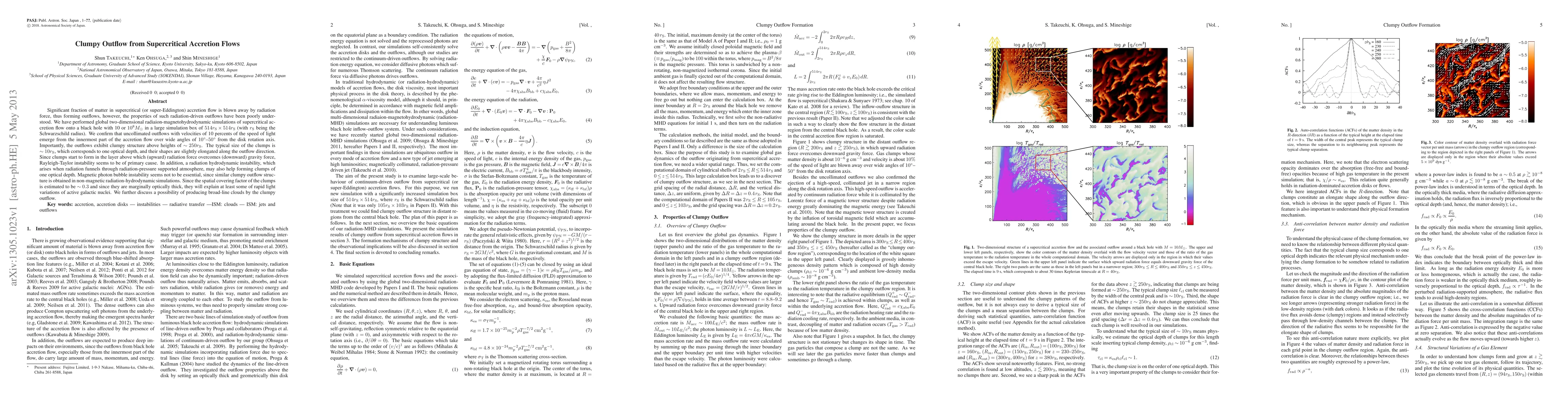 This paper presents global two-dimensional simulations of supercritical accretion flows onto black holes, revealing that radiation-driven outflows emerge with velocities of 10% of the speed of light and exhibit a clumpy structure above ~250 Schwarzschild radii. The clumps, formed by Rayleigh-Taylor instability, may explain rapid light variations in active galactic nuclei.