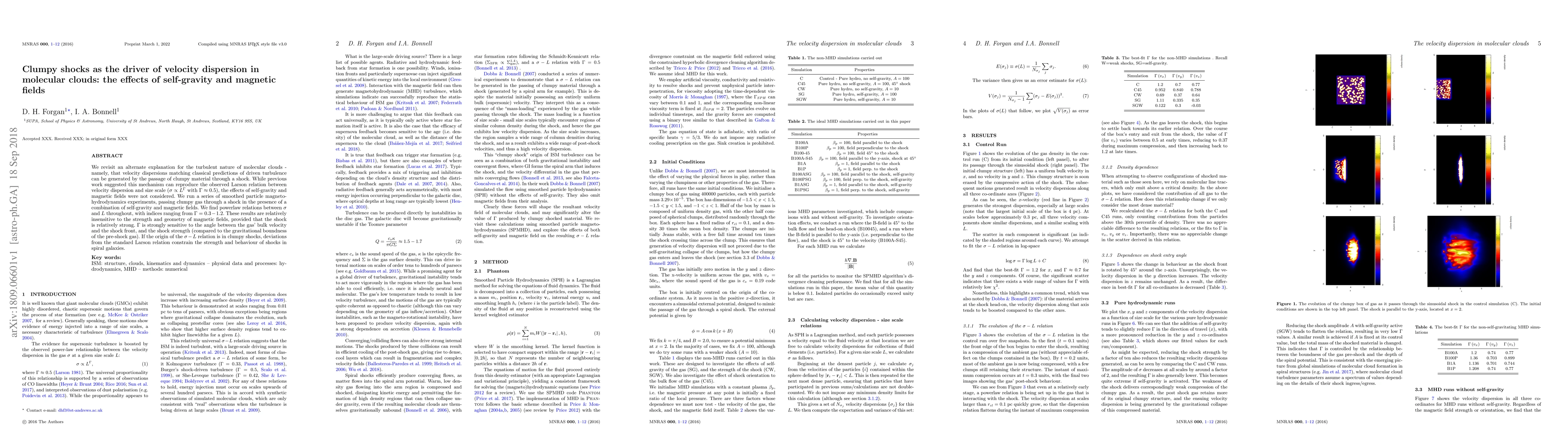 This paper explores how clumpy shocks can generate velocity dispersion in molecular clouds, considering self-gravity and magnetic fields. Experiments show that clumpy shocks can reproduce the Larson relation, with $\Gamma$ values varying based on shock strength and gas velocity angles.