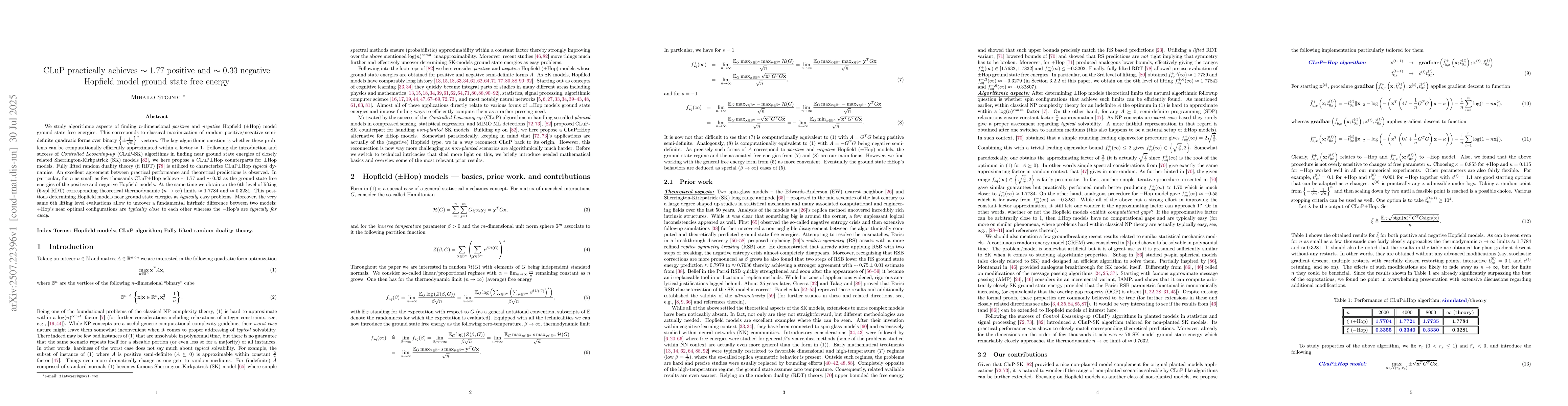 We study algorithmic aspects of finding $n$-dimensional \emph{positive} and \emph{negative} Hopfield ($\pm$Hop) model ground state free energies. This corresponds to classical maximization of random positive/negative semi-definite quadratic forms over binary $\left \{\pm \frac{1}{\sqrt{n}} \right \}^n$ vectors. The key algorithmic question is whether these problems can be computationally efficiently approximated within a factor $\approx 1$. Following the introduction and success of \emph{Controlled Loosening-up} (CLuP-SK) algorithms in finding near ground state energies of closely related Sherrington-Kirkpatrick (SK) models [82], we here propose a CLuP$\pm$Hop counterparts for $\pm$Hop models. Fully lifted random duality theory (fl RDT) [78] is utilized to characterize CLuP$\pm$Hop \emph{typical} dynamics. An excellent agreement between practical performance and theoretical predictions is observed. In particular, for $n$ as small as few thousands CLuP$\pm$Hop achieve $\sim 1.77$ and $\sim 0.33$ as the ground state free energies of the positive and negative Hopfield models. At the same time we obtain on the 6th level of lifting (6-spl RDT) corresponding theoretical thermodynamic ($n\rightarrow\infty$) limits $\approx 1.7784$ and $\approx 0.3281$. This positions determining Hopfield models near ground state energies as \emph{typically} easy problems. Moreover, the very same 6th lifting level evaluations allow to uncover a fundamental intrinsic difference between two models: $+$Hop's near optimal configurations are \emph{typically close} to each other whereas the $-$Hop's are \emph{typically far away}.