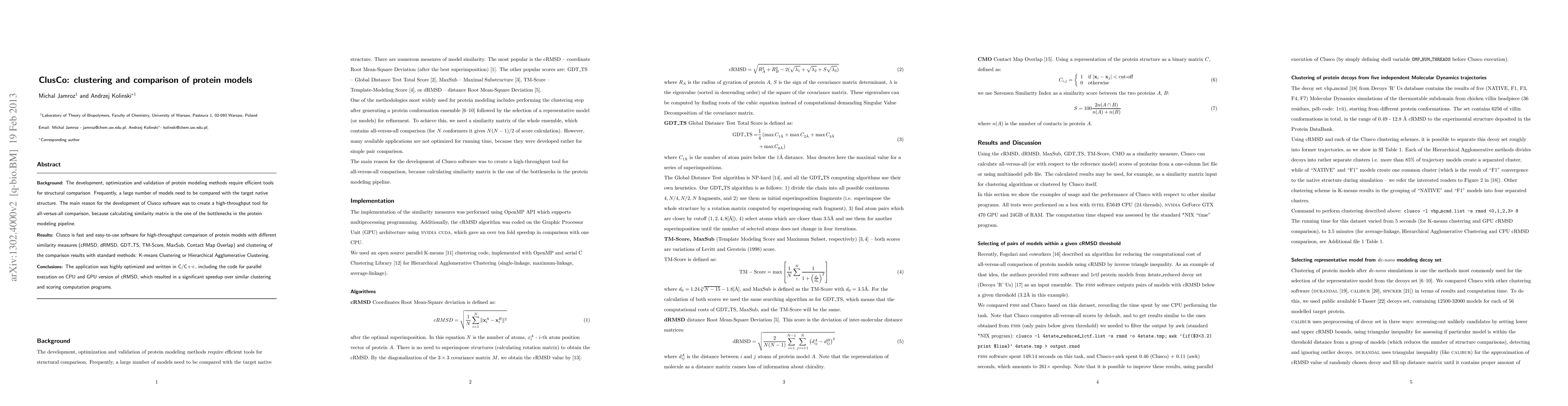 Background: The development, optimization and validation of protein modeling methods require efficient tools for structural comparison. Frequently, a large number of models need to be compared with the target native structure. The main reason for the development of Clusco software was to create a high-throughput tool for all-versus-all comparison, because calculating similarity matrix is the one of the bottlenecks in the protein modeling pipeline. Results: Clusco is fast and easy-to-use software for high-throughput comparison of protein models with different similarity measures (cRMSD, dRMSD, GDT_TS, TM-Score, MaxSub, Contact Map Overlap) and clustering of the comparison results with standard methods: K-means Clustering or Hierarchical Agglomerative Clustering. Conclusions: The application was highly optimized and written in C/C++, including the code for parallel execution on CPU and GPU version of cRMSD, which resulted in a significant speedup over similar clustering and scoring computation programs.