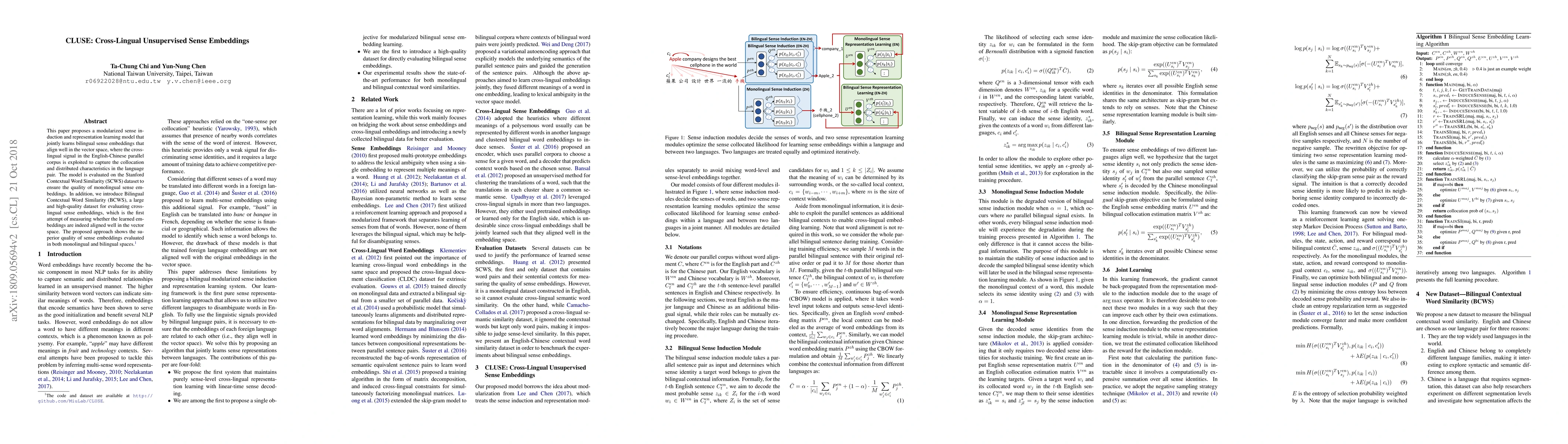 The paper introduces CLUSE, a model for cross-lingual sense embeddings that learns bilingual sense representations aligned in vector space using an English-Chinese parallel corpus. It evaluates the model on the Stanford Contextual Word Similarity dataset and introduces the Bilingual Contextual Word Similarity dataset for cross-lingual evaluation, demonstrating superior sense embedding quality.