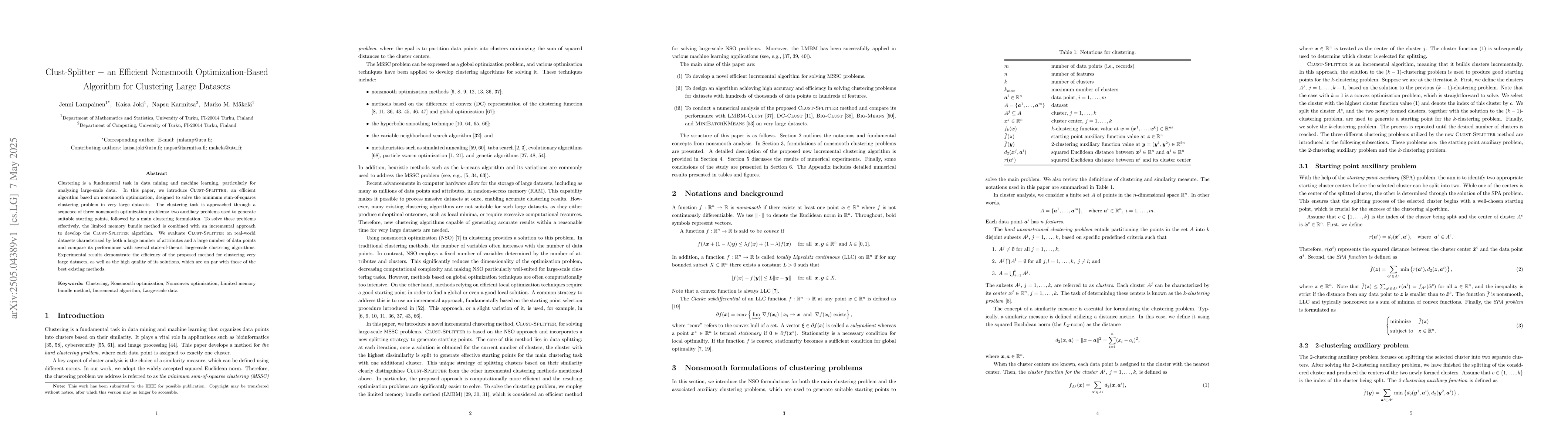 Clust-Splitter is an efficient algorithm for clustering large datasets using nonsmooth optimization, achieving high-quality solutions on par with state-of-the-art methods.