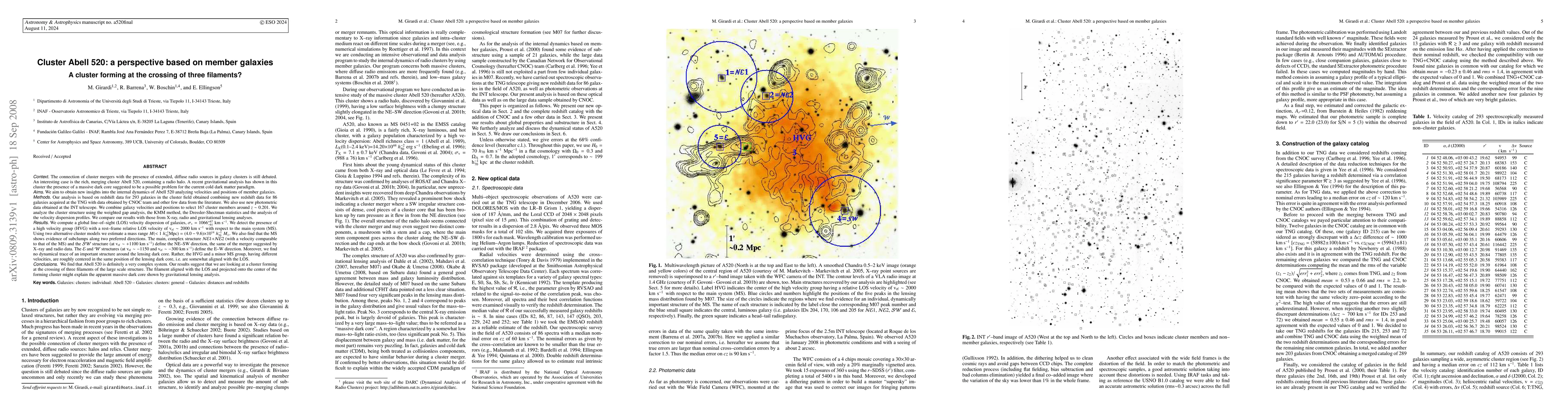 The study of Abell 520, a rich merging cluster with a radio halo, reveals its complex internal dynamics through analysis of 293 galaxies' redshift data. The findings suggest the cluster is forming at the intersection of three filaments, potentially explaining the massive dark core detected by gravitational lensing.