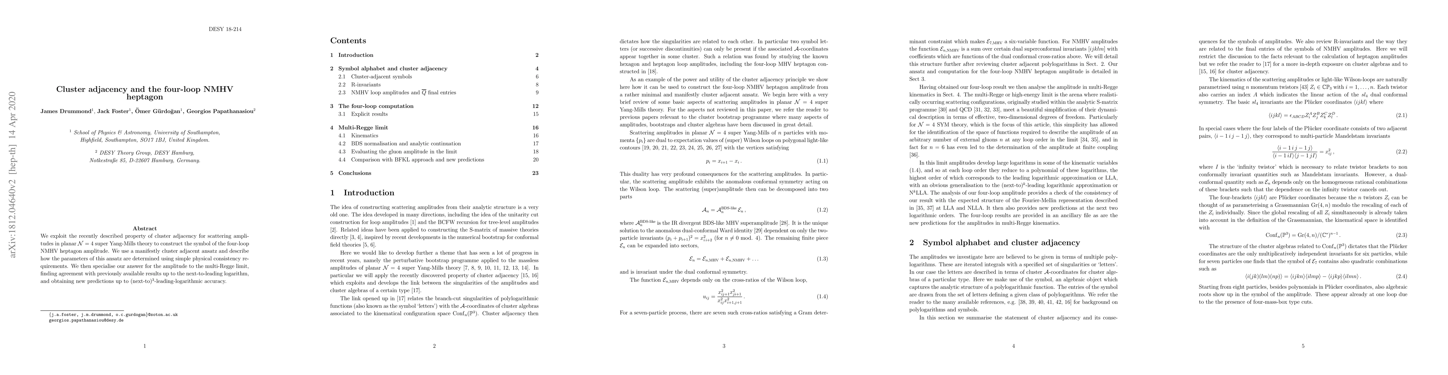 We exploit the recently described property of cluster adjacency for scattering amplitudes in planar $\mathcal{N}=4$ super Yang-Mills theory to construct the symbol of the four-loop NMHV heptagon amplitude. We use a manifestly cluster adjacent ansatz and describe how the parameters of this ansatz are determined using simple physical consistency requirements. We then specialise our answer for the amplitude to the multi-Regge limit, finding agreement with previously available results up to the next-to-leading logarithm, and obtaining new predictions up to (next-to)$^3$-leading-logarithmic accuracy.