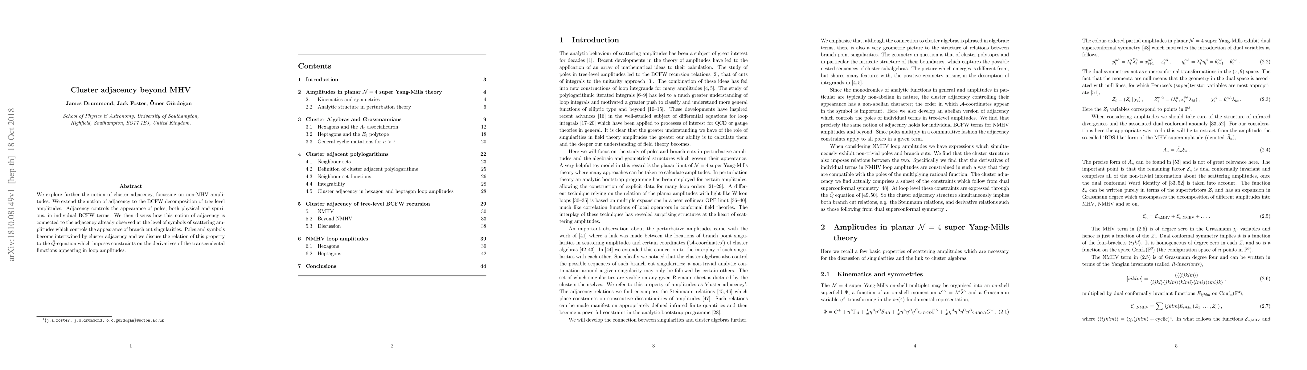 This research extends the concept of cluster adjacency to non-MHV amplitudes, linking it to BCFW decomposition and pole appearances. It also connects this to symbol-level adjacency affecting branch cut singularities, and discusses its relation to the u201car{Q}u201d-equation constraining transcendental functions in loop amplitudes.