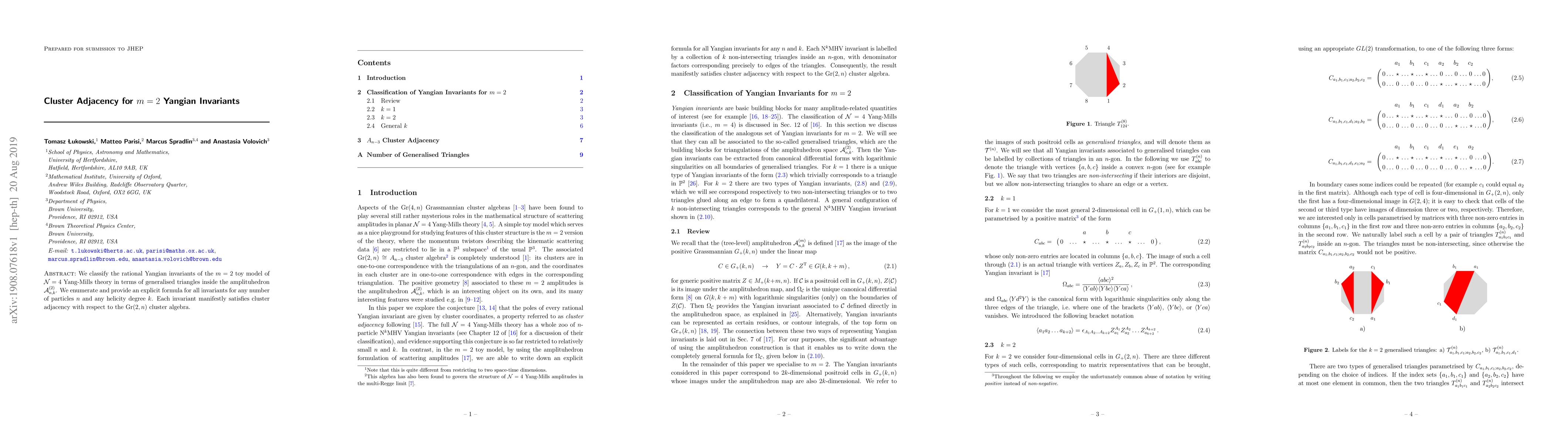 We classify the rational Yangian invariants of the $m=2$ toy model of $\mathcal{N}=4$ Yang-Mills theory in terms of generalised triangles inside the amplituhedron $\mathcal{A}_{n,k}^{(2)}$. We enumerate and provide an explicit formula for all invariants for any number of particles $n$ and any helicity degree $k$. Each invariant manifestly satisfies cluster adjacency with respect to the $Gr(2,n)$ cluster algebra.