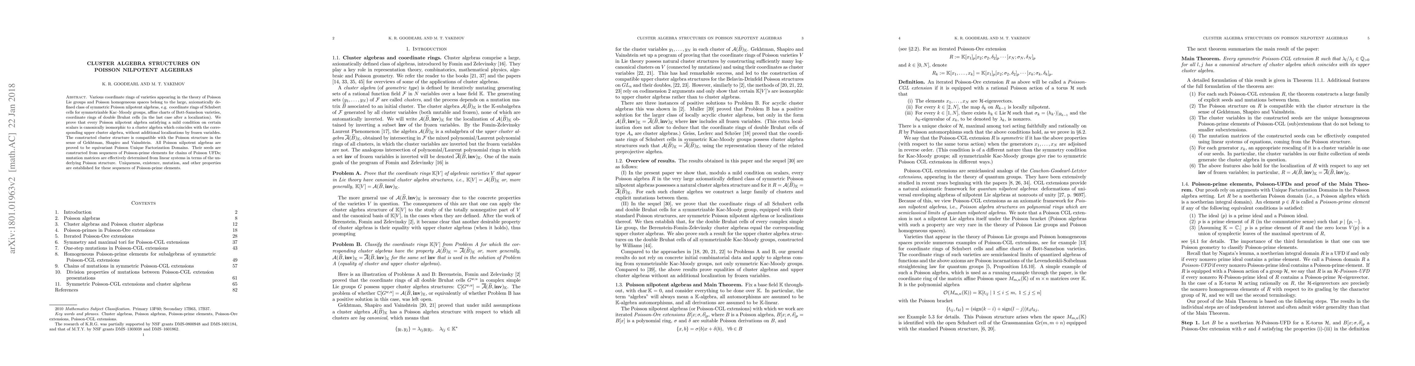 Various coordinate rings of varieties appearing in the theory of Poisson Lie groups and Poisson homogeneous spaces belong to the large, axiomatically defined class of symmetric Poisson nilpotent algebras, e.g. coordinate rings of Schubert cells for symmetrizable Kac--Moody groups. We prove that every Poisson nilpotent algebra satisfying a mild condition on certain scalars is canonically isomorphic to a cluster algebra which coincides with the corresponding upper cluster algebra, without additional localizations by frozen variables. The constructed cluster structure is compatible with the Poisson structure in the sense of Gekhtman, Shapiro and Vainshtein. All Poisson nilpotent algebras are proved to be equivariant Poisson Unique Factorization Domains. Their seeds are constructed from sequences of Poisson-prime elements for chains of Poisson UFDs; mutation matrices are effectively determined from linear systems in terms of the underlying Poisson structure. Uniqueness, existence, mutation, and other properties are established for these sequences of Poisson-prime elements.