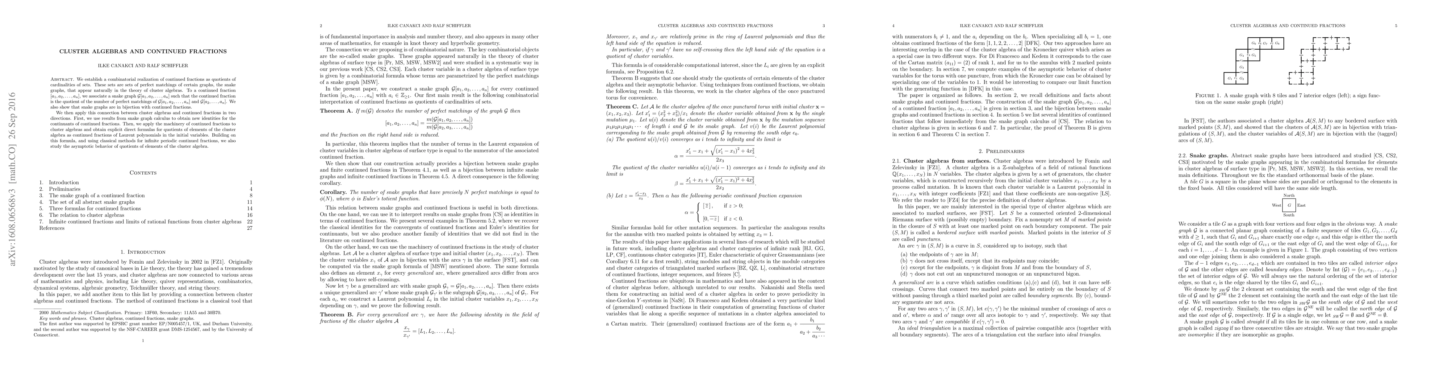 We establish a combinatorial realization of continued fractions as quotients of cardinalities of sets. These sets are sets of perfect matchings of certain graphs, the snake graphs, that appear naturally in the theory of cluster algebras. To a continued fraction $[a_1,a_2,\ldots,a_n]$, we associate a snake graph $\mathcal{G}[a_1,a_2,\ldots,a_n]$ such that the continued fraction is the quotient of the number of perfect matchings of $\mathcal{G}[a_1,a_2,\ldots,a_n]$ and $\mathcal{G}[a_2,\ldots,a_n]$. We also show that snake graphs are in bijection with continued fractions. We then apply this connection between cluster algebras and continued fractions in two directions. First, we use results from snake graph calculus to obtain new identities for the continuants of continued fractions. Then, we apply the machinery of continued fractions to cluster algebras and obtain explicit direct formulas for quotients of elements of the cluster algebra as continued fractions of Laurent polynomials in the initial variables. Building on this formula, and using classical methods for infinite periodic continued fractions, we also study the asymptotic behavior of quotients of elements of the cluster algebra.